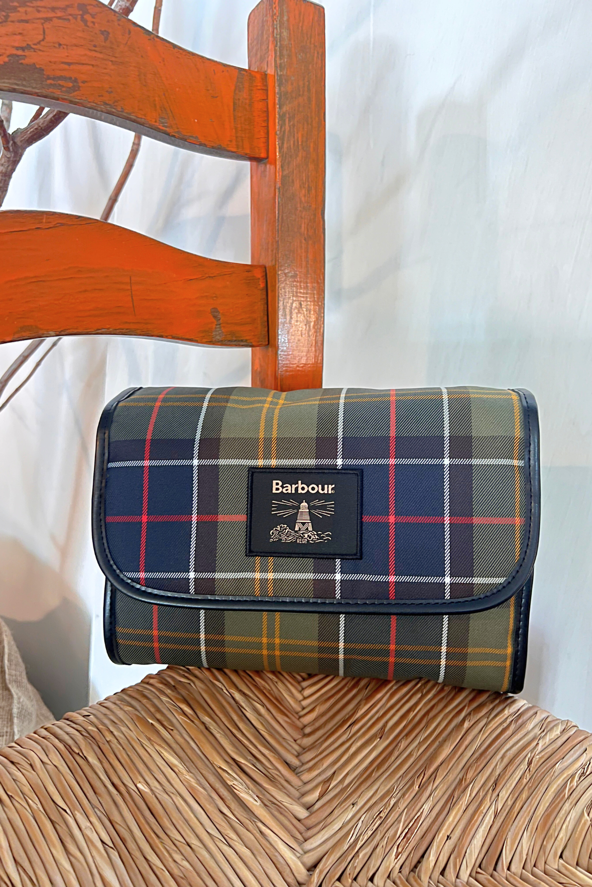Beauty Case a scomparti in nylon a fantasia scozzese con rifiniture effetto pelle. Possibilità di appenderlo grazie ad un gancetto. Una tasca aperta e una con zip; due tasche medio ampie con zip e una tasca grande con zip. Chiusura con bottoni automatici. Misure: base 25cm, altezza 19cm (aperto 55cm).