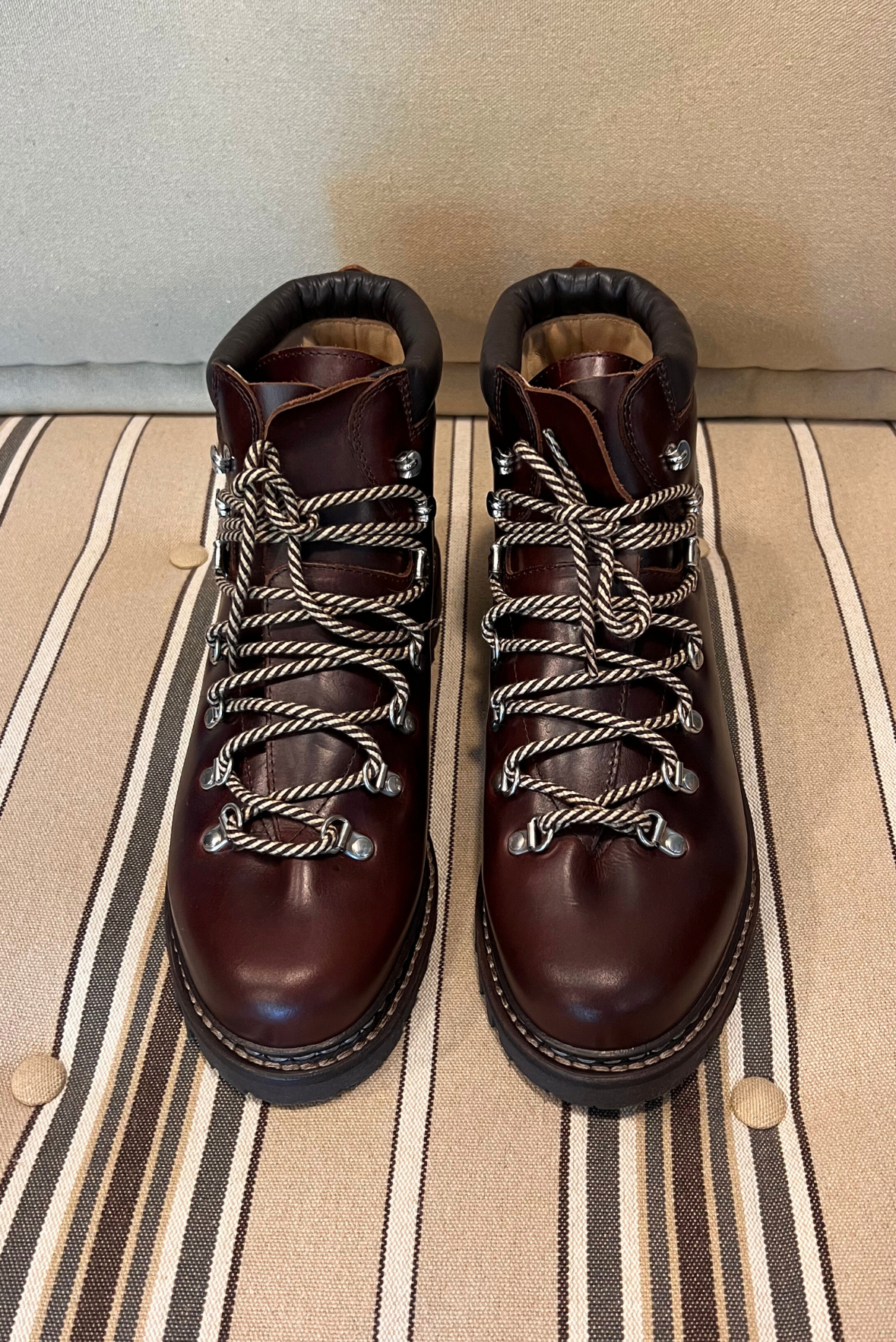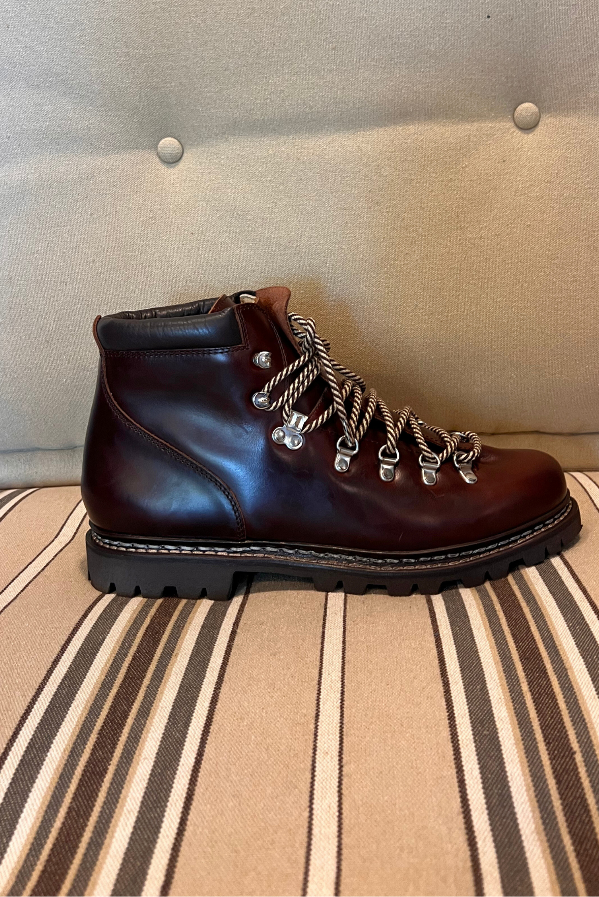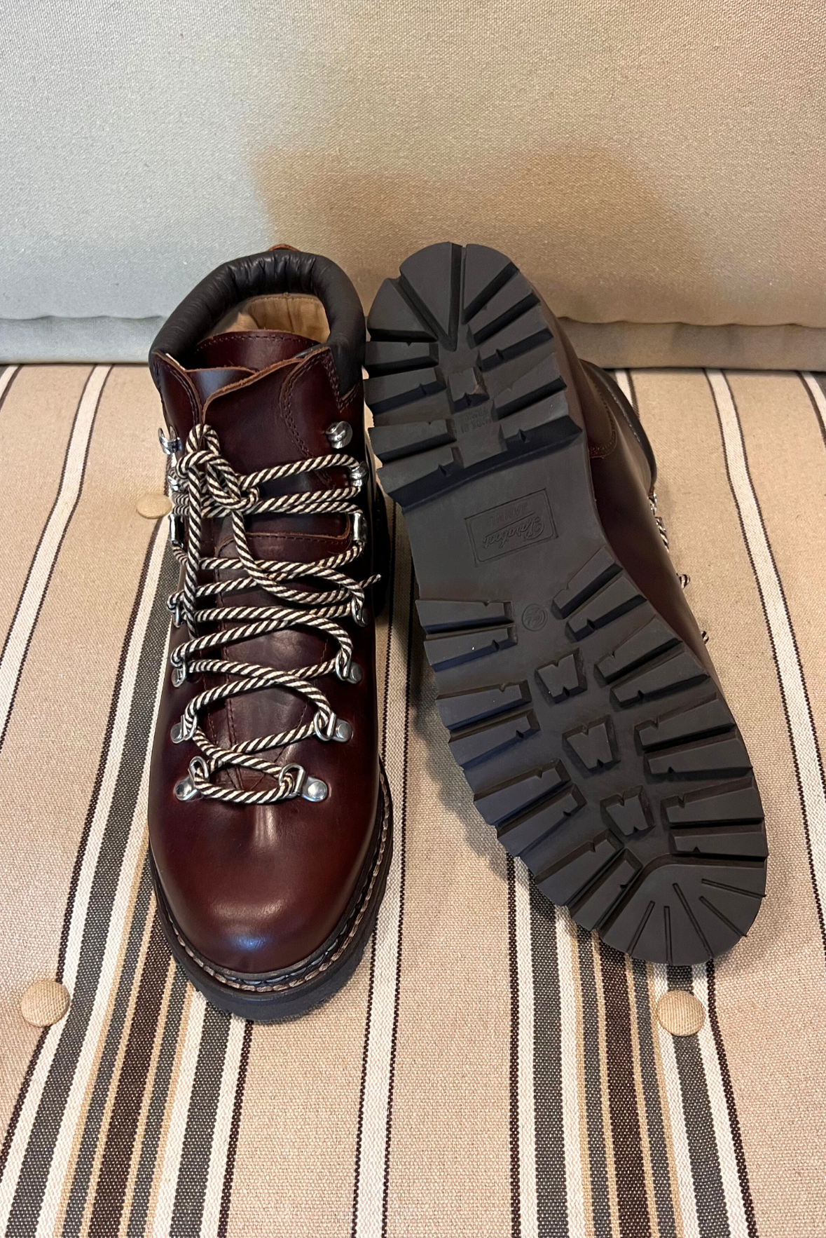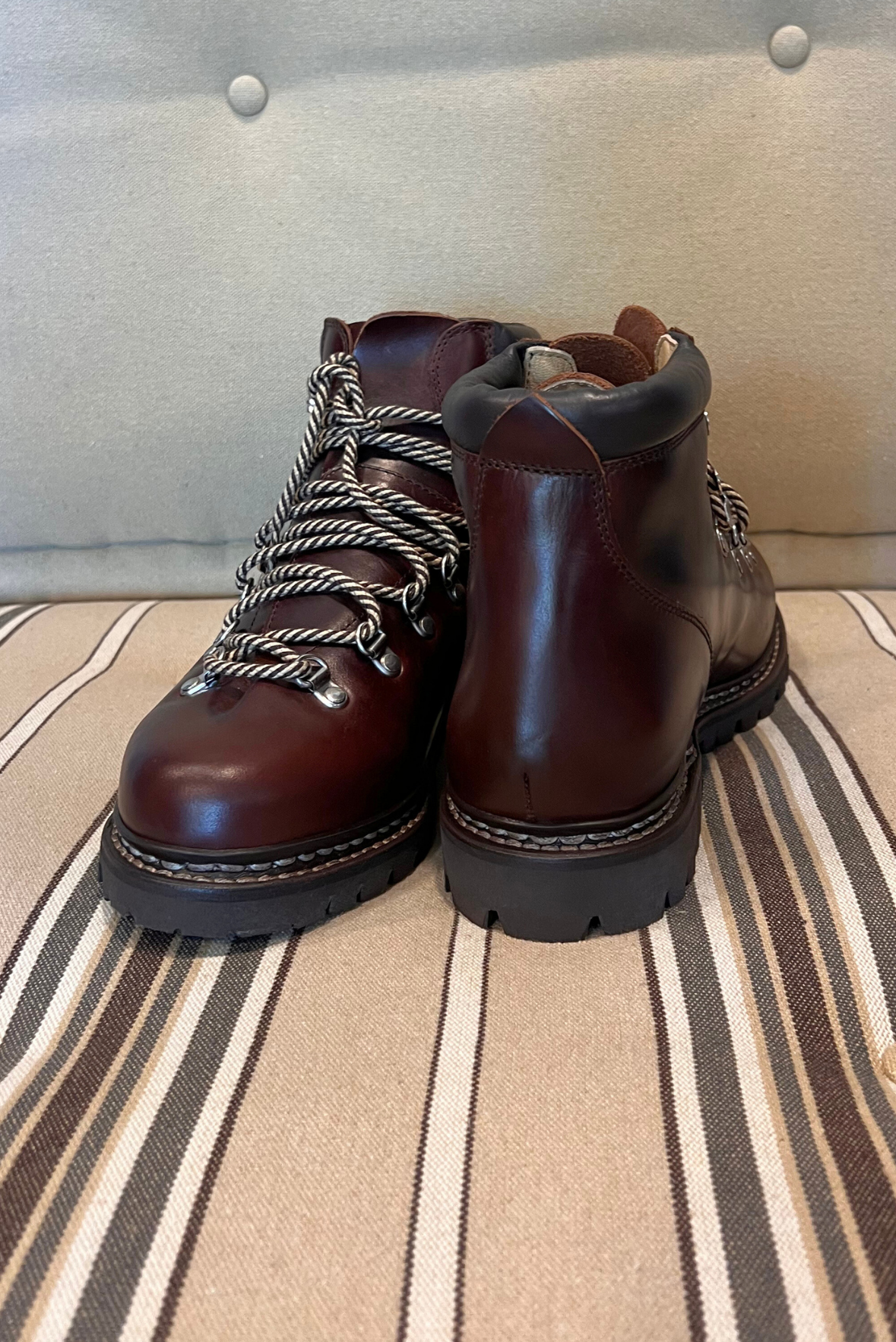 Calzatura Avoriatz, pedula in pelle. Chiusura tramite quattro passanti e tre ganci con lacci in cotone. Doppia impuntura che tiene insieme la tomaia e la suola, assicurando resistenza e assoluta impermeabilità. Fodera interna in pelle. Autentiche suole Paraboot in gomma. Lavorazione Artigianale. Realizzate in Francia.