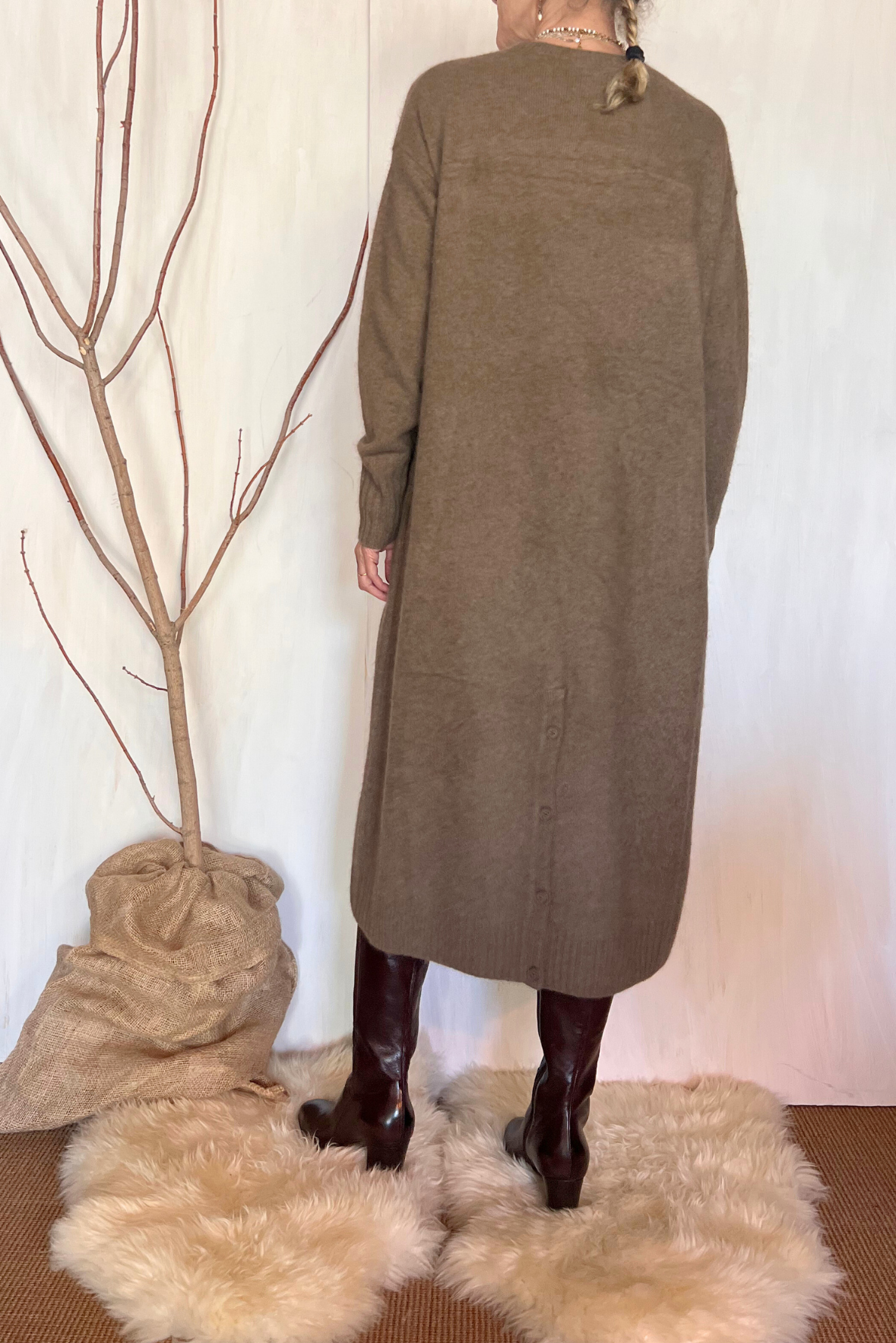 Abito lungo a girocollo in maglia. Due tasche laterali. Vestibilità morbida (taglia indossata 36 su una 40IT). Composizione 40% lana, 40% pelo di Murmansky, 20% poliammide