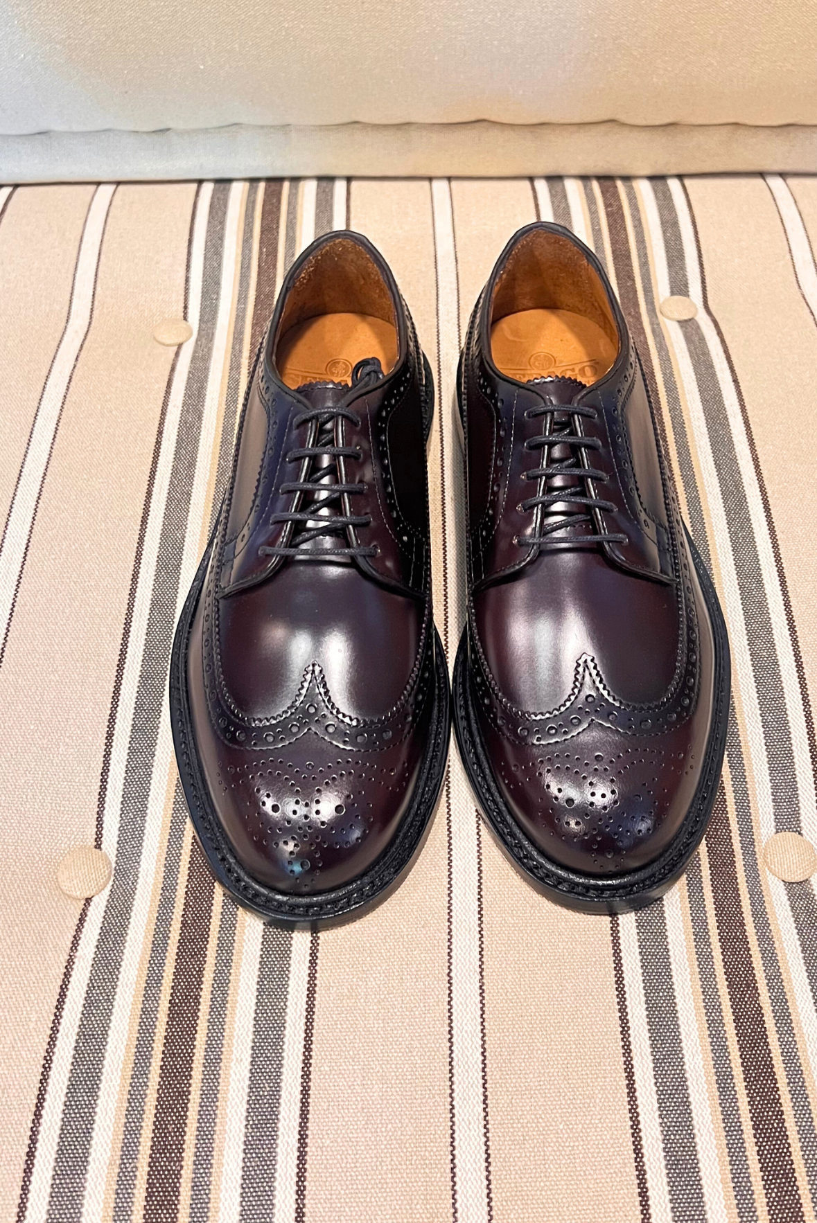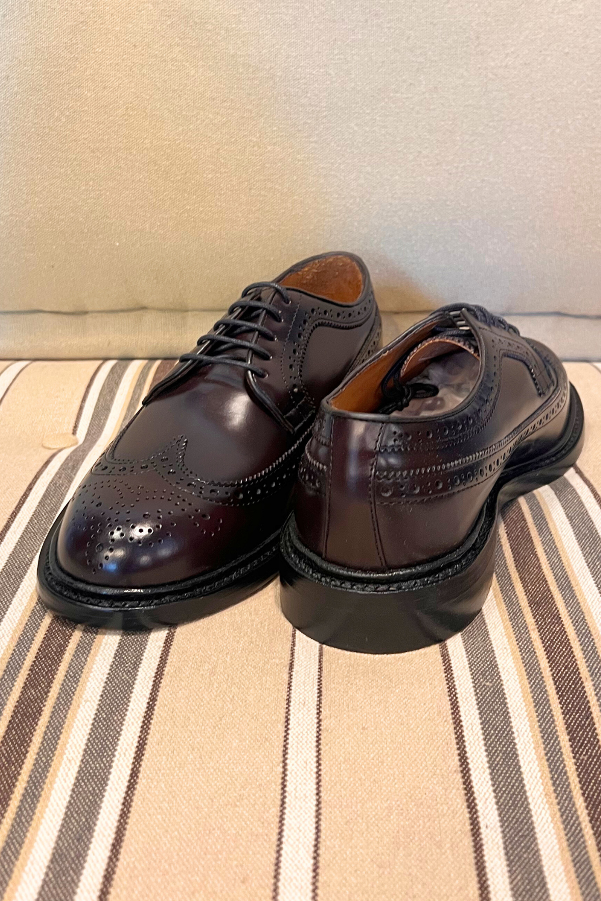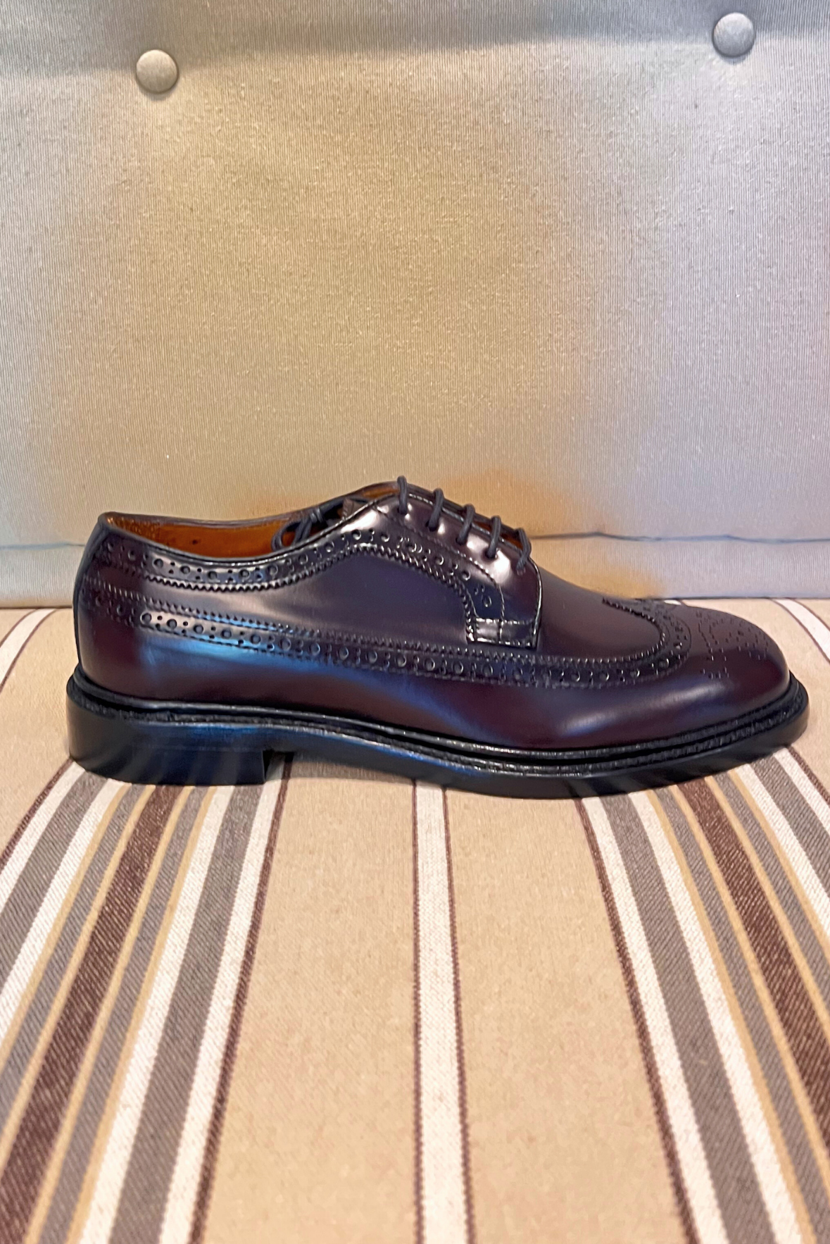Calzatura Everett Gyw con motivo decorativo ad ala di rondine fino al tacco in pelle pieno fiore spazzolata liscia di colore marrone bordeaux. Cucita a mano, fodera in pelle, tacco modellato in gomma e suola in cuoio. Composizione 100% pelle