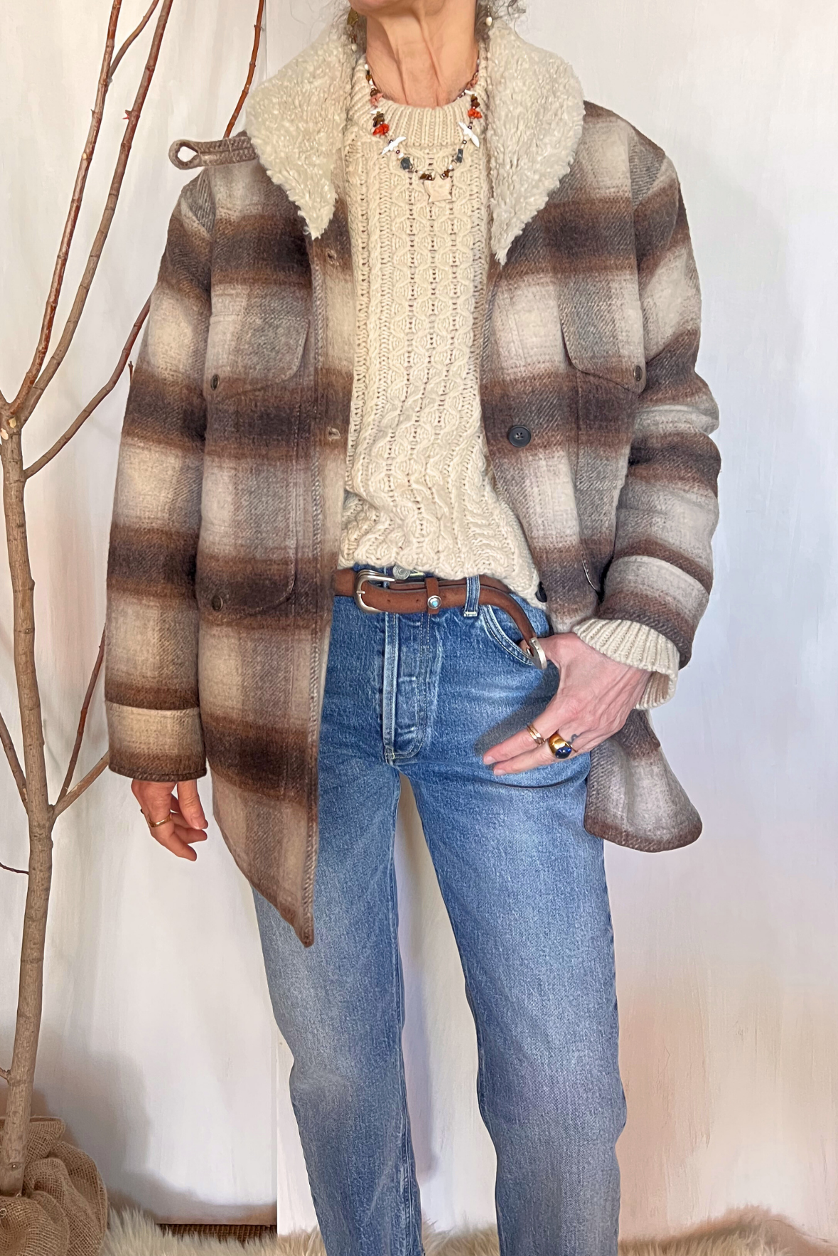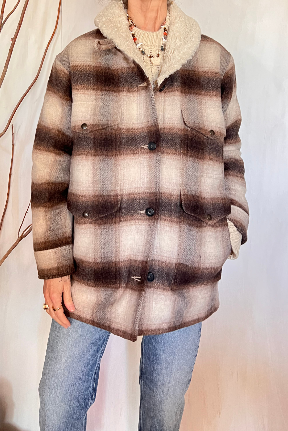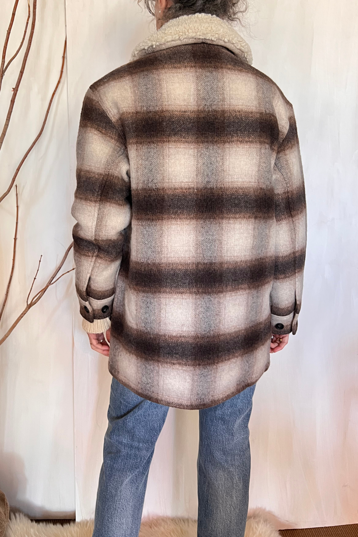 Giubbotto in lana a fantasia check imbottito con dettaglio collo pile. Chiusura con bottoni sul davanti. Quattro tasche con chiusura con bottone automatico di cui due sul petto e due in basso con tasca laterale. Tasca interna. Vestibilità morbida (taglia idnossata S su una 40IT). Composizione 73% lana, 26% poliammide, 3% altre fibre