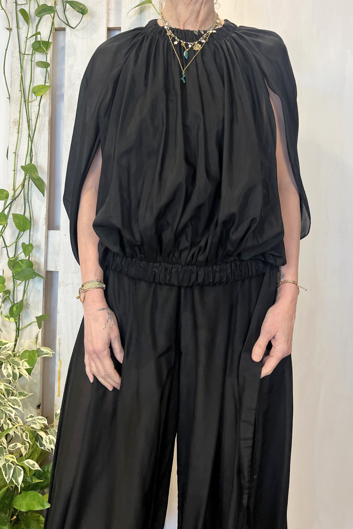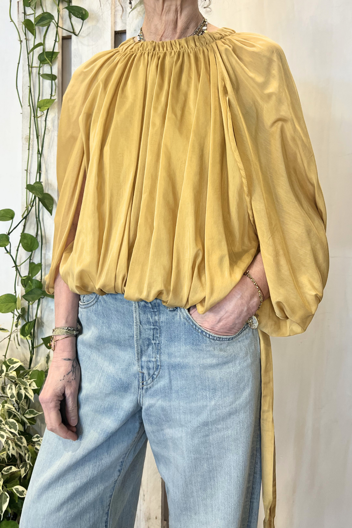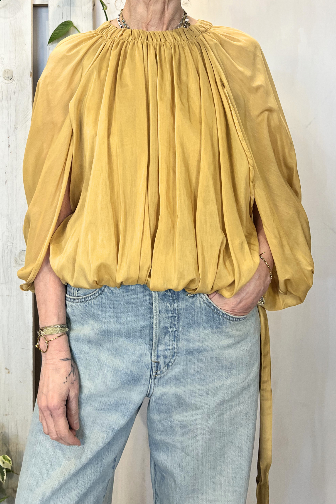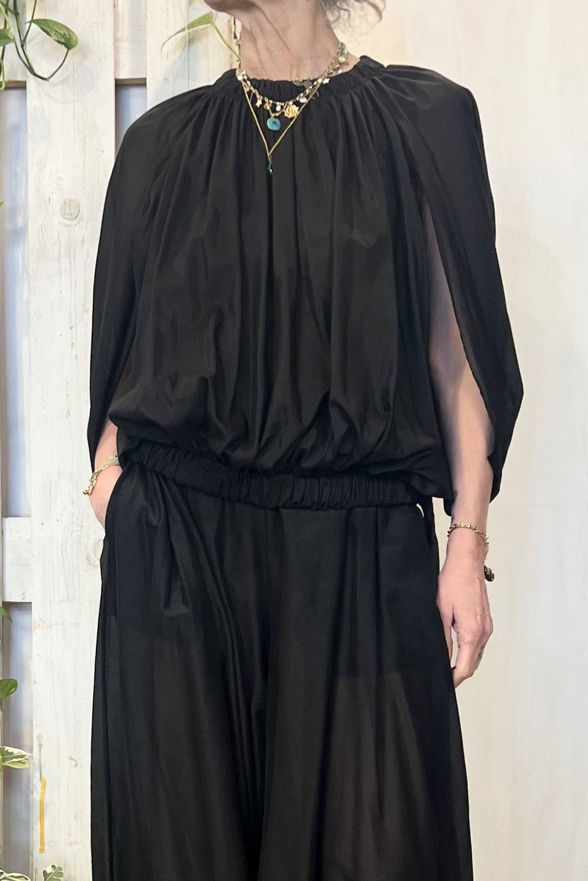 Top smanicato effetto palloncino con elastico in vita e nastrini. Vestibilità regolare (taglia indossata 40 su una 40IT). Composizione 69% cotone, 31% seta