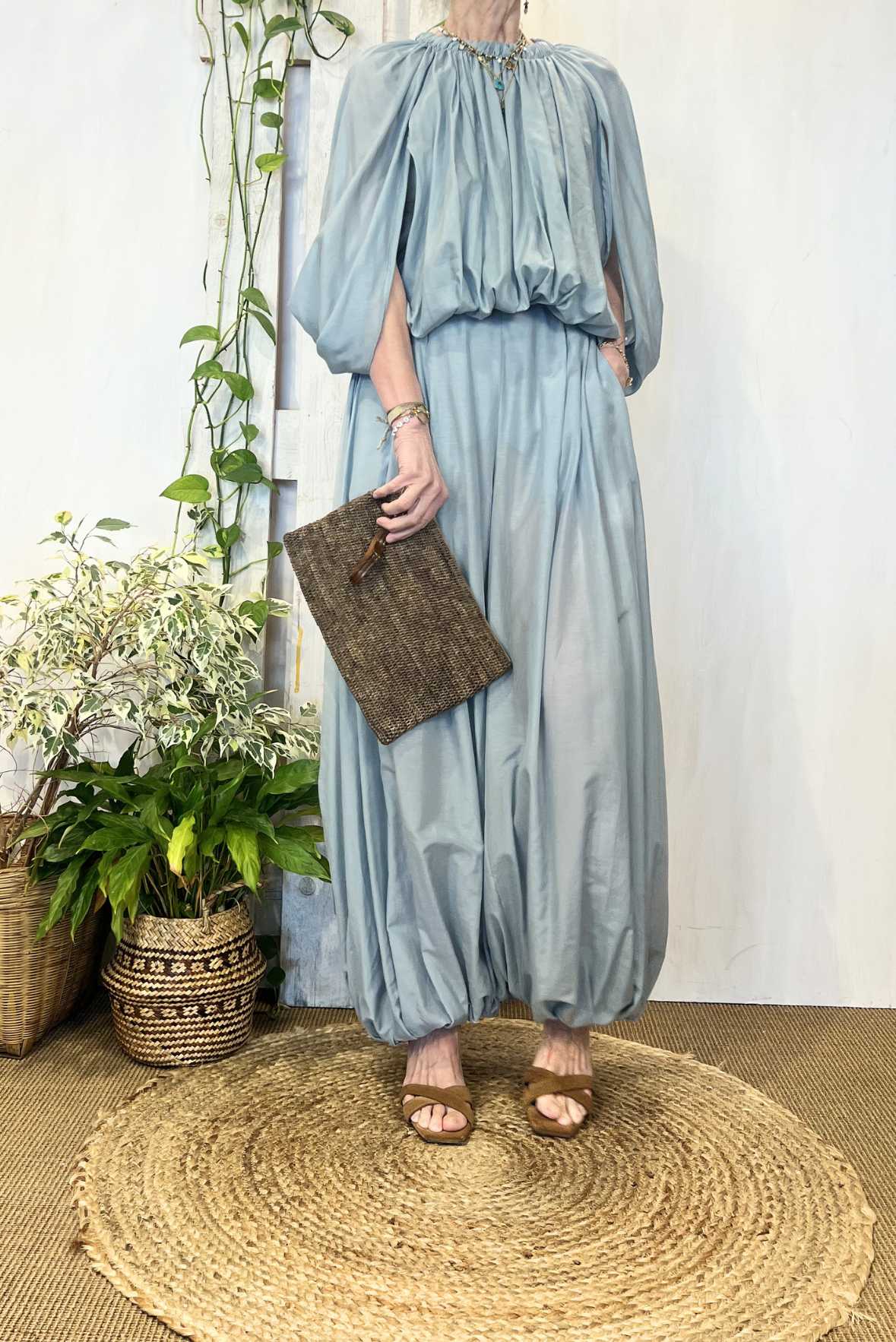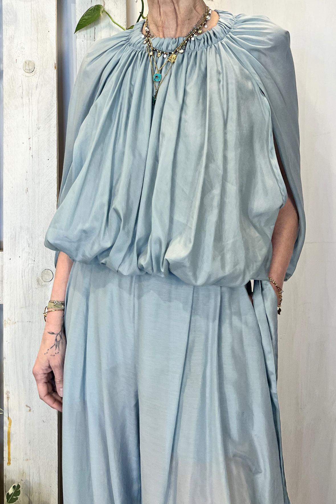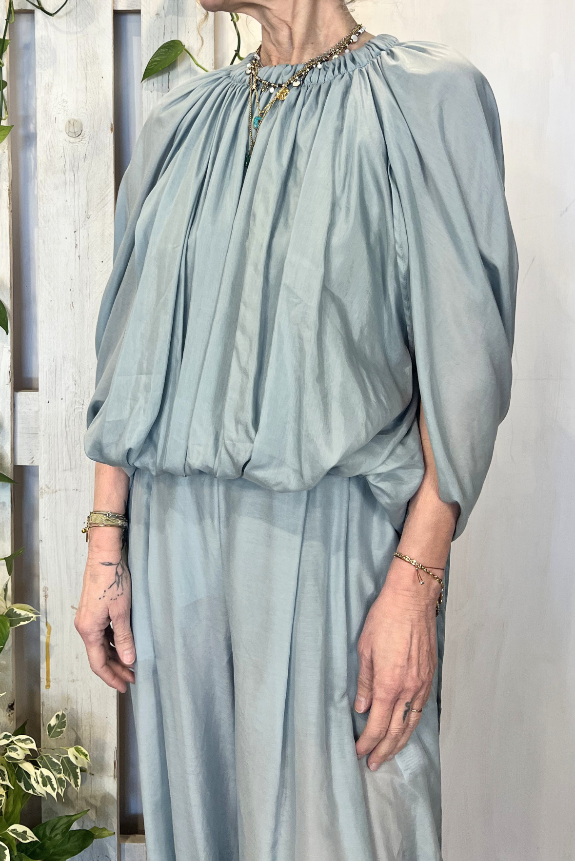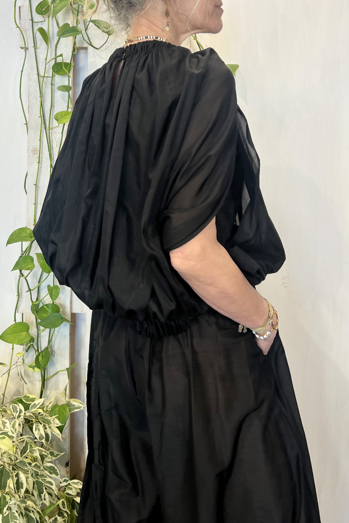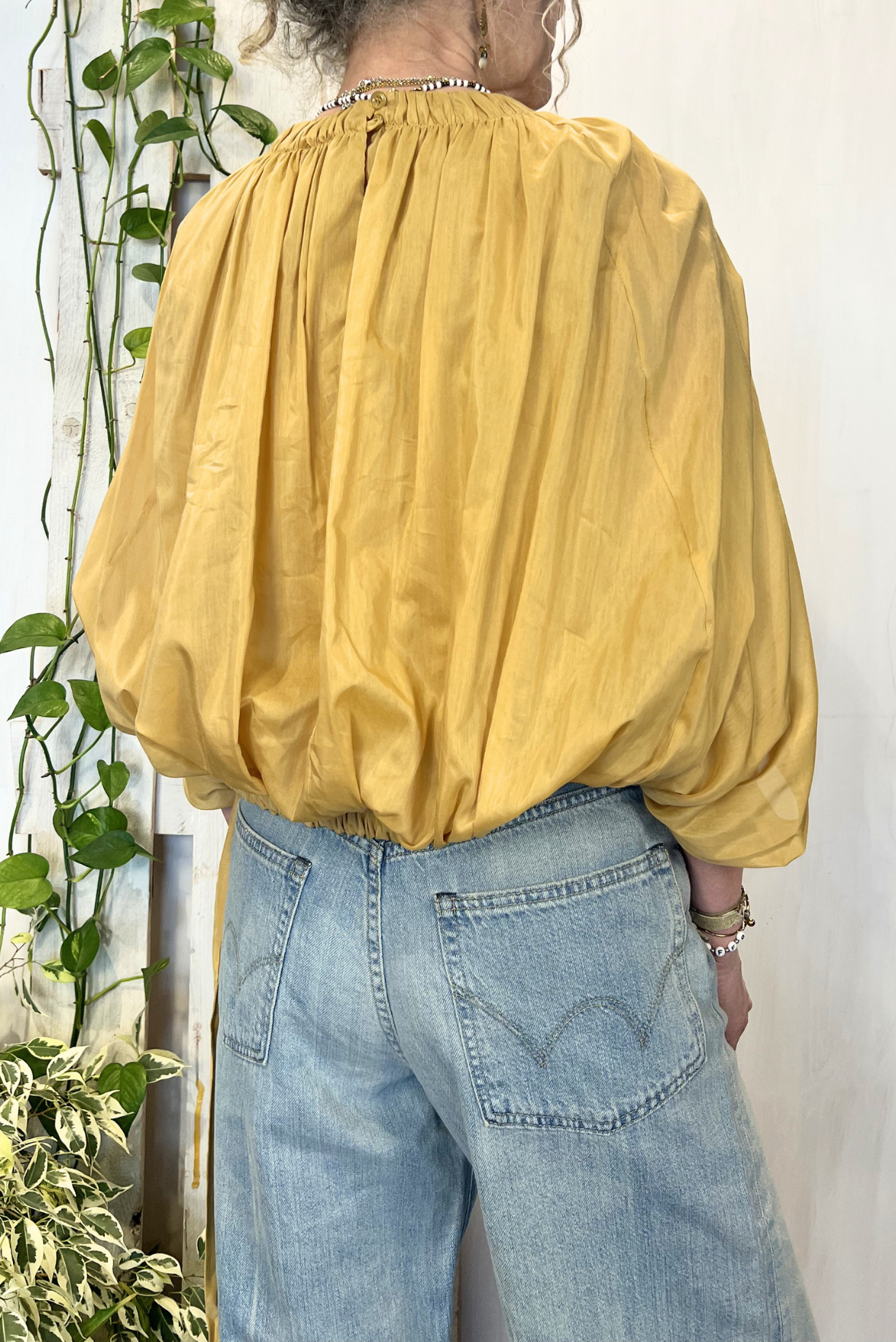 Top smanicato effetto palloncino con elastico in vita e nastrini. Vestibilità regolare (taglia indossata 40 su una 40IT). Composizione 69% cotone, 31% seta