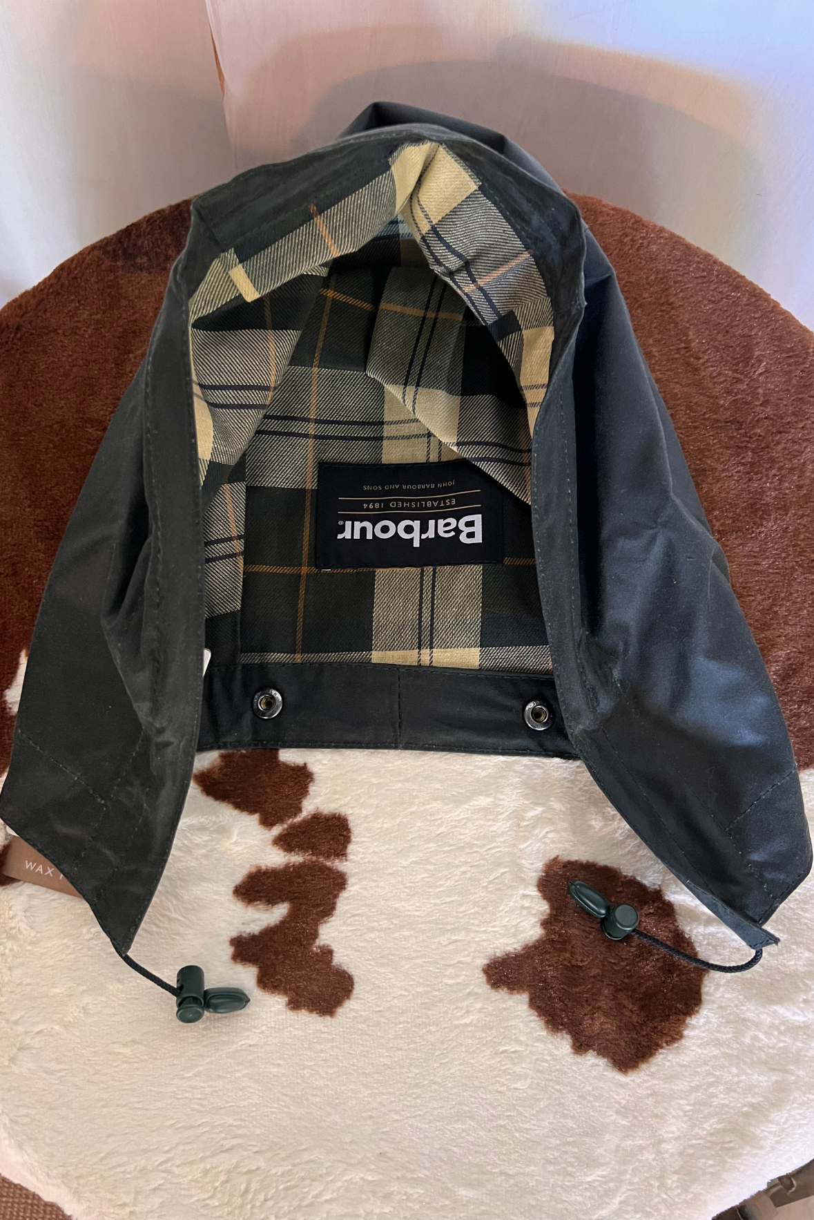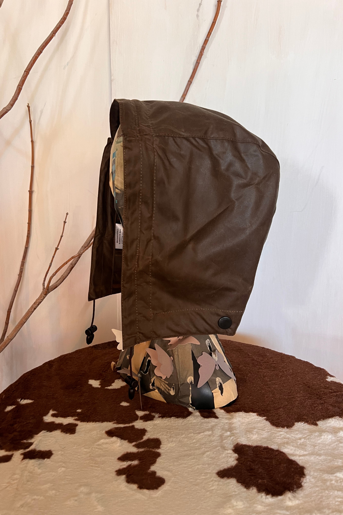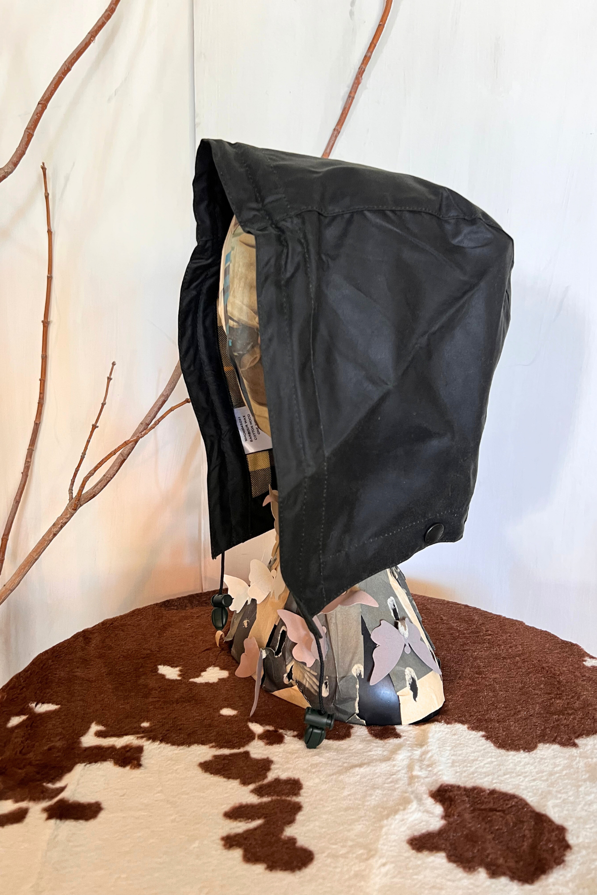 Cappuccio cerato con bottoni automatici e coulisse. Interno a contrasto con fantasia tartan. Taglia unica. Composizione 100% cotone