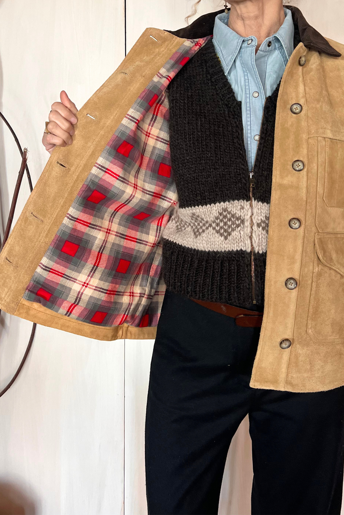 Giubbotto Cruiser variante premium in pelle scamosciata e lana. Pelle morbida ed elastica scamosciata, calda al tatto, accostata a una fodera interna in flanella di cotone spazzolato. Quattro tasche frontali con patta e bottone sul davanti. Chiusura anteriore e polsini con bottoni. Vestibilità regolare (taglia indossata S su una 40IT). Composizione 100% pelle; fodera e dettagli 100% cotone