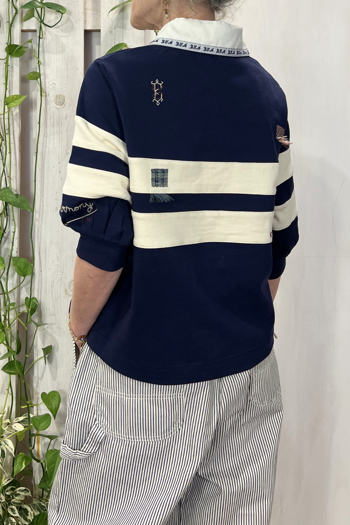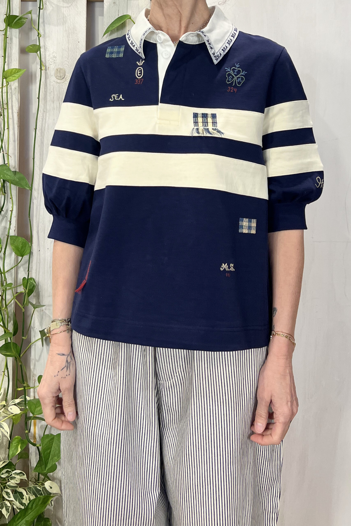 Polo modello Rugby a righe con ricami a contrasto. Manica a sbuffo. Vestibilità morbida (taglia indossata S su una 40IT). Composizione 100% cotone