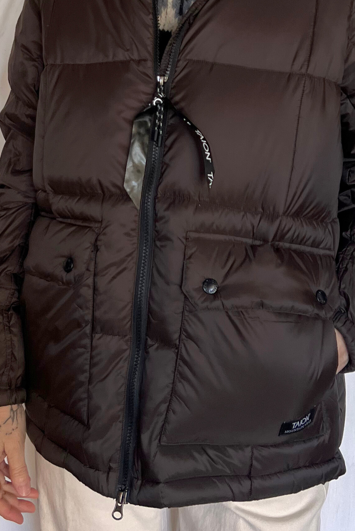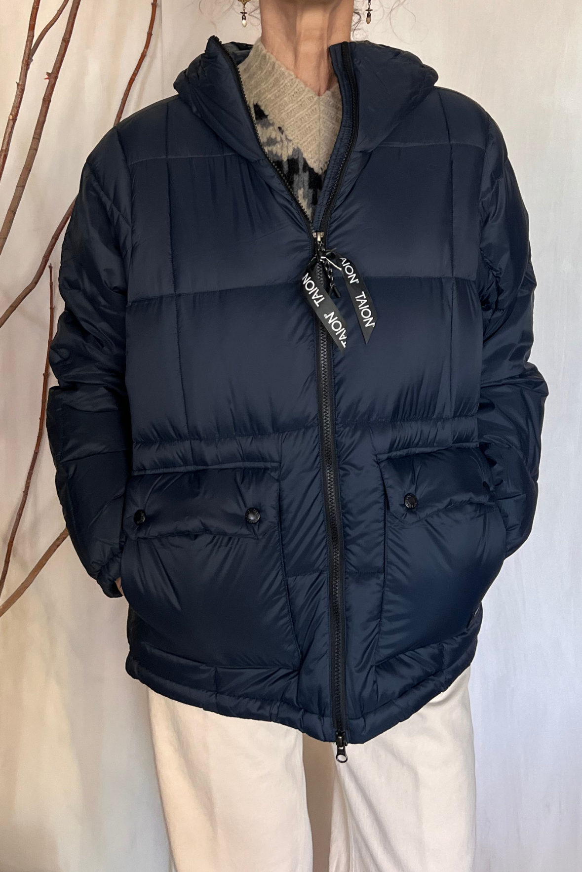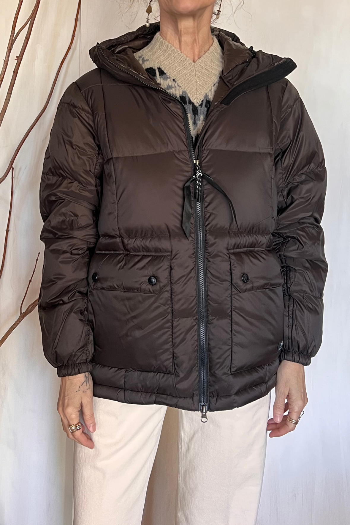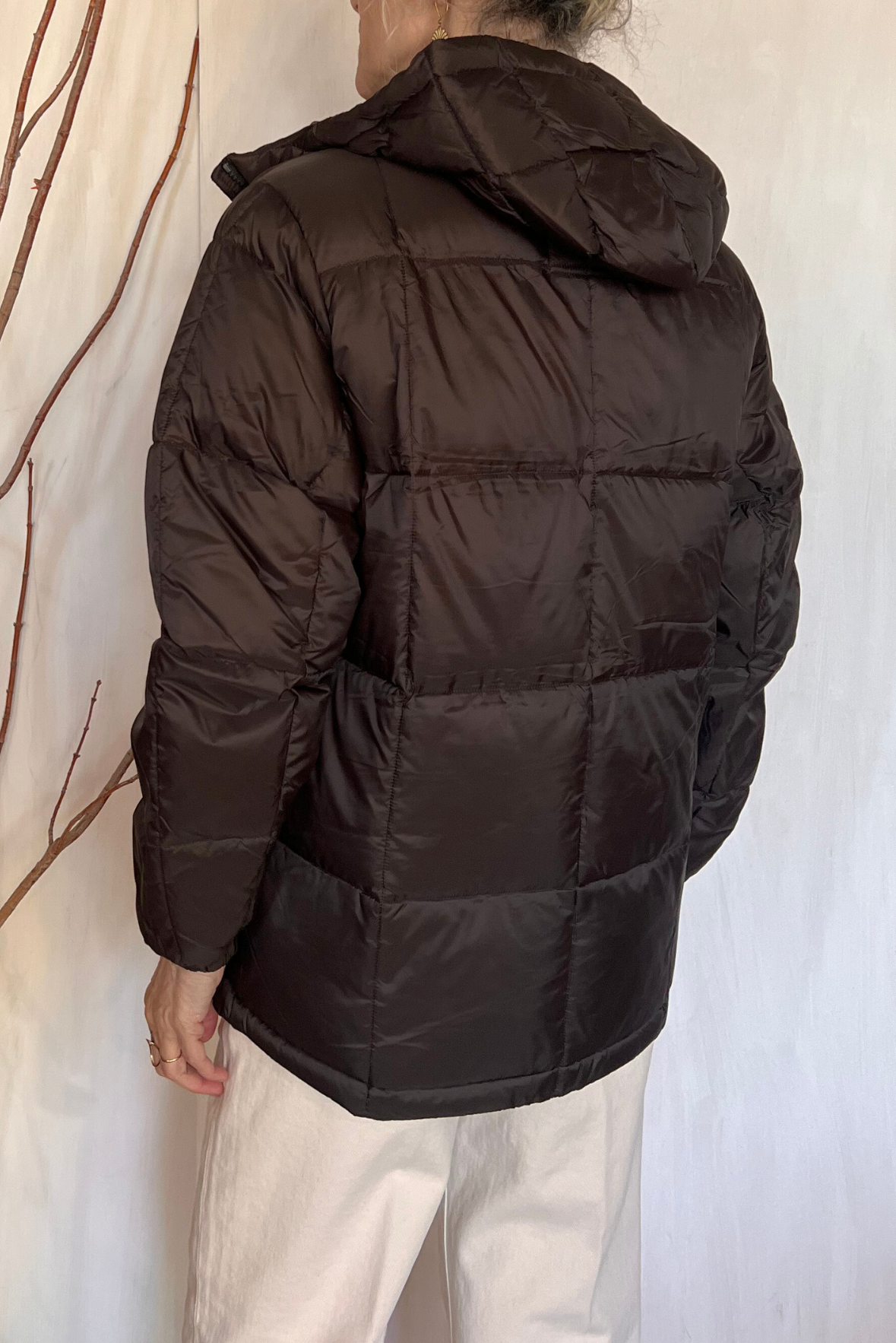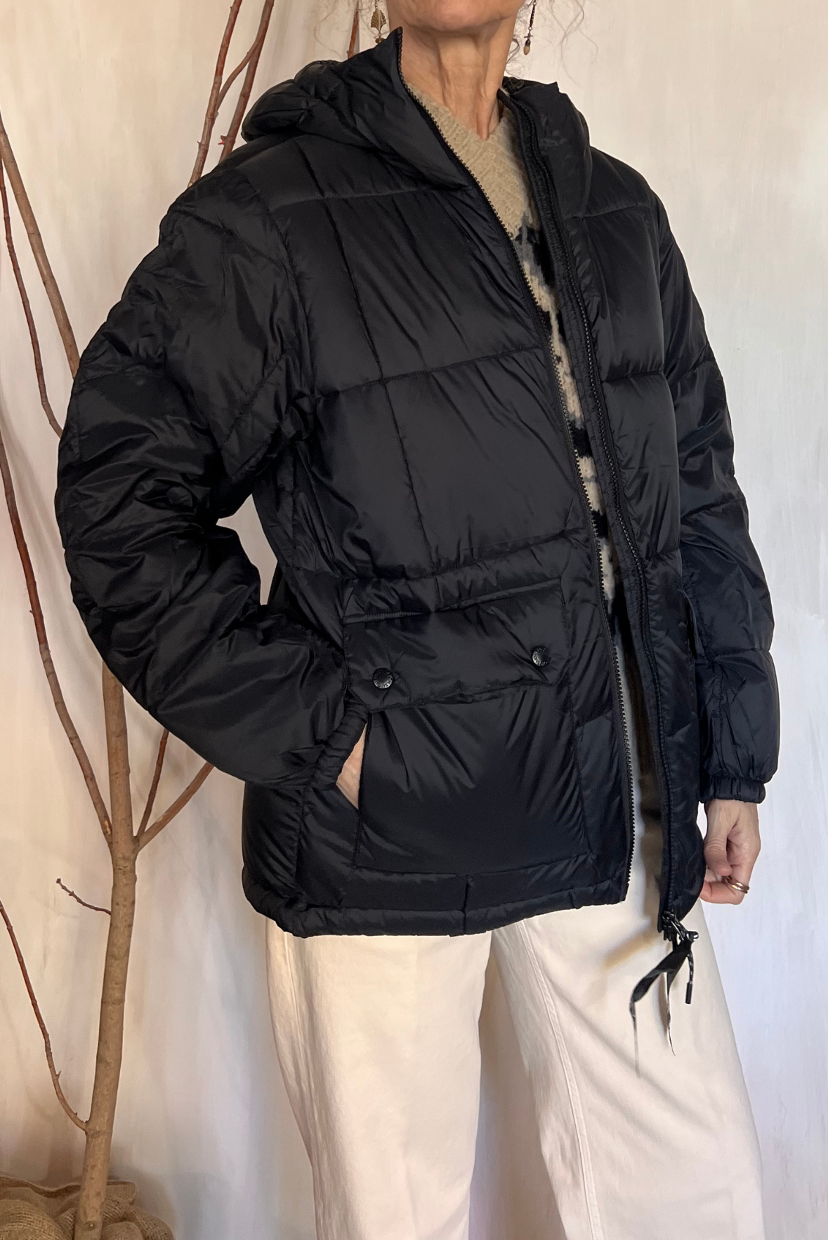 Piumino imbottito trapuntato a tinta unita con cappuccio. Due tasche lapplicate sul davanti con chiusura con bottoni automatici e due tasche laterali con interno pile. Chiusura con zip a doppio cursore. Coulisse in fondo. Vestibilità morbida (taglia indossata XS su una 40IT). Composizione 95% piuma, 5% penne. Incluso un sacchetto con coulisse in cui ripiegare il capo.
