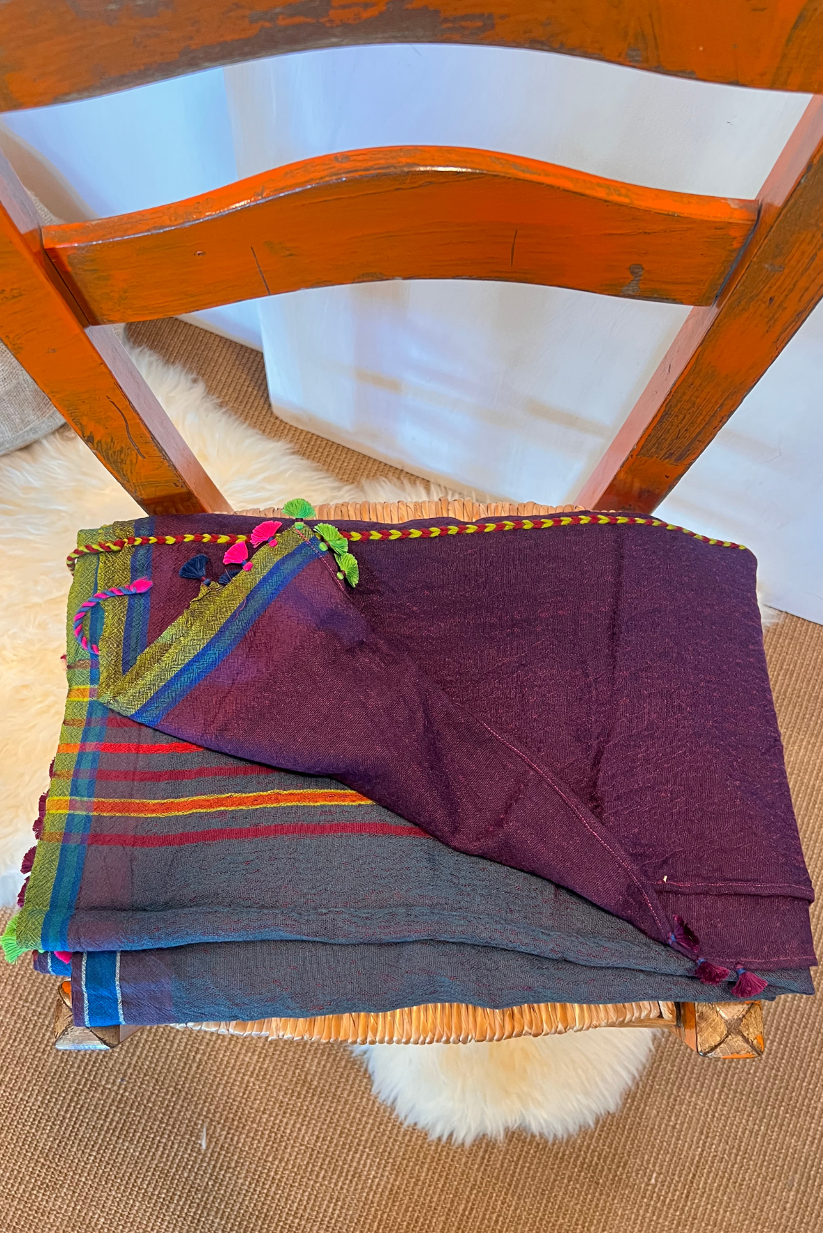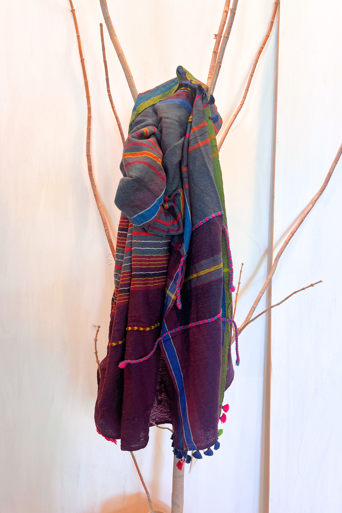 Sciarpa fantasia in lana con nappine e ricami colorati a contrasto. Composizione 100% cachmere. Misure: 232x93cm