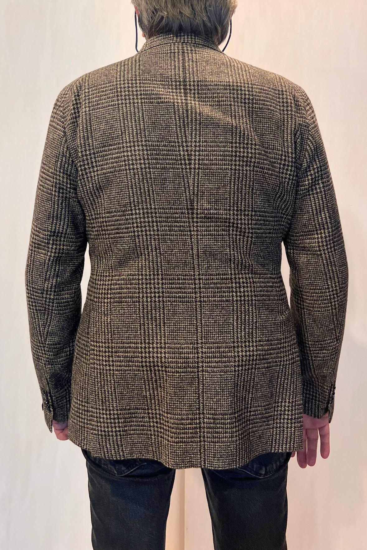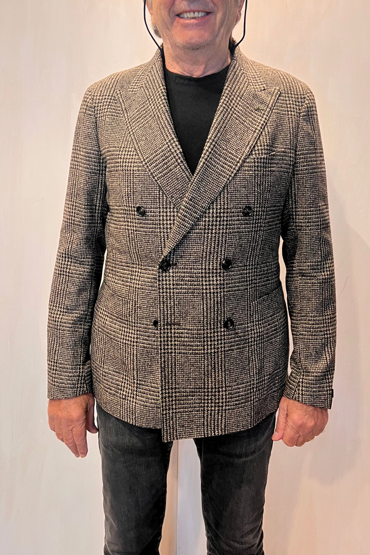 Giacca modello Montecarlo a doppio petto misto lana e alpaca a quadretti. Una tasca sul petto e due tasche applicate sul davanti. Due spacchetti laterali posteriori. Interno sfoderato. Vestibilità regolare. Composizione 28% alpaca, 27% lana, 25% cotone, 20% poliammide