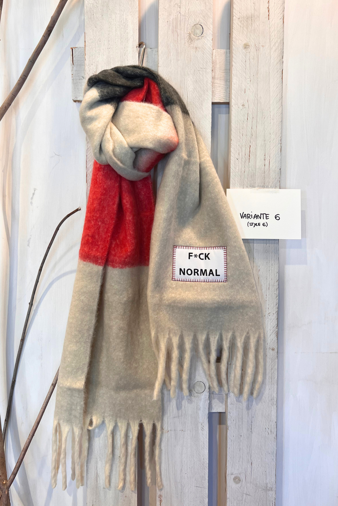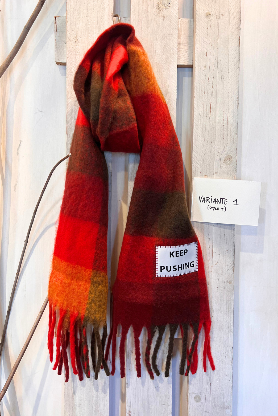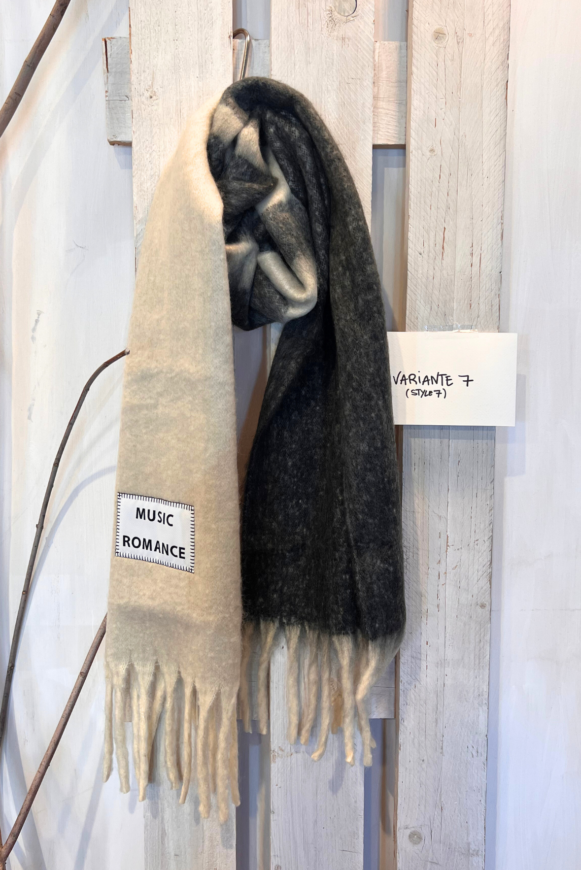 Sciarpa con frangine e maxi etichetta con scritta. Misura: 200x38 cm. Composizione 100% fibre riciclate - REPREVE poliestere dato da bottiglie di plastica riciclate. Made in Spain