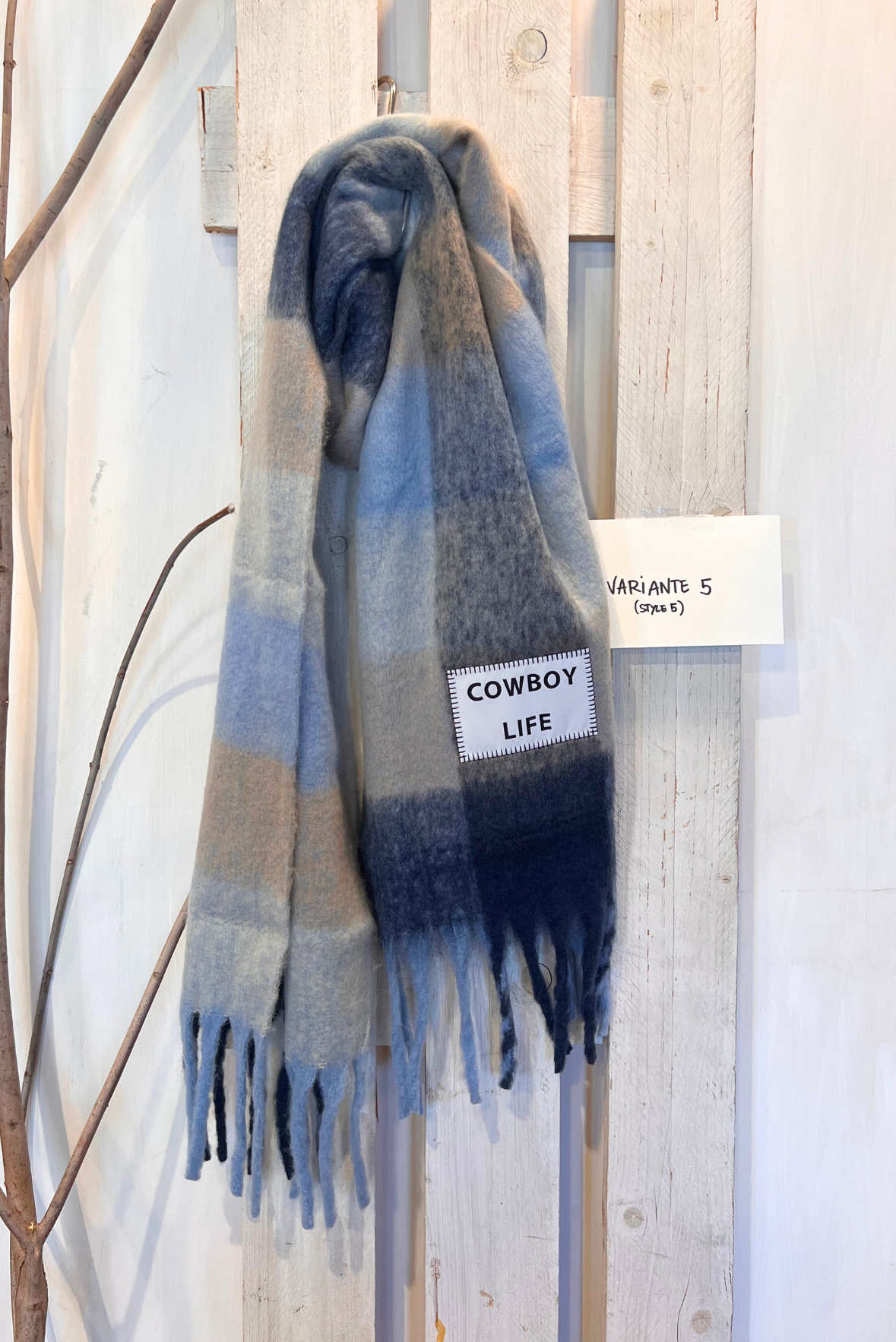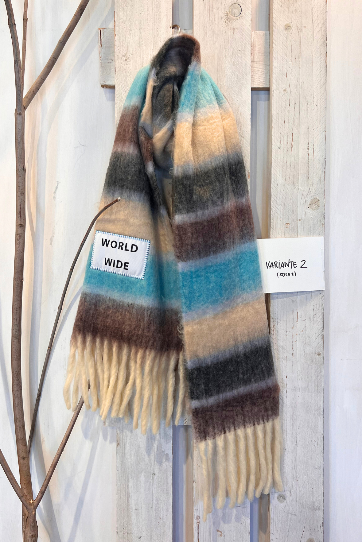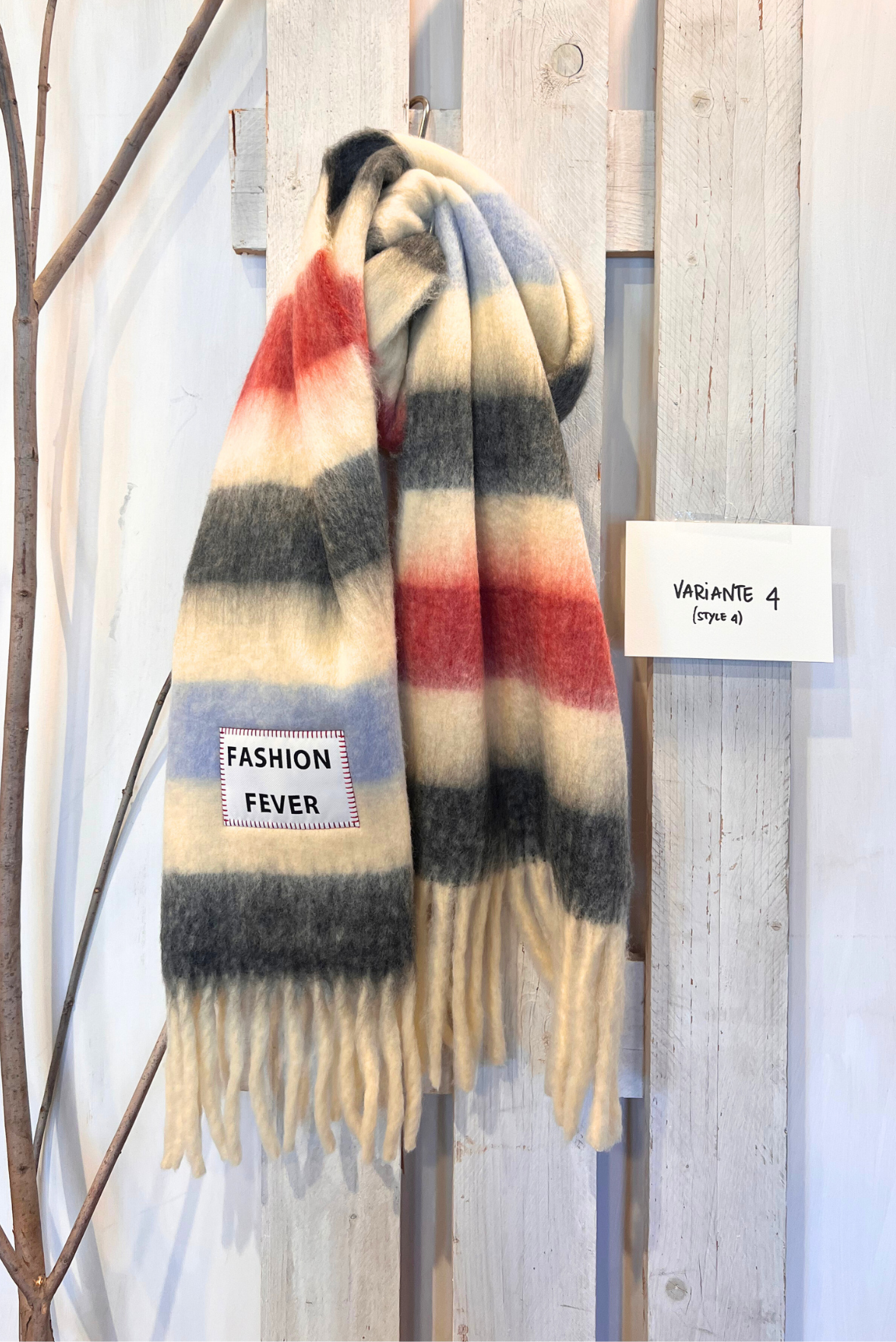 Sciarpa con frangine e maxi etichetta con scritta. Misura: 200x38 cm. Composizione 100% fibre riciclate - REPREVE poliestere dato da bottiglie di plastica riciclate. Made in Spain