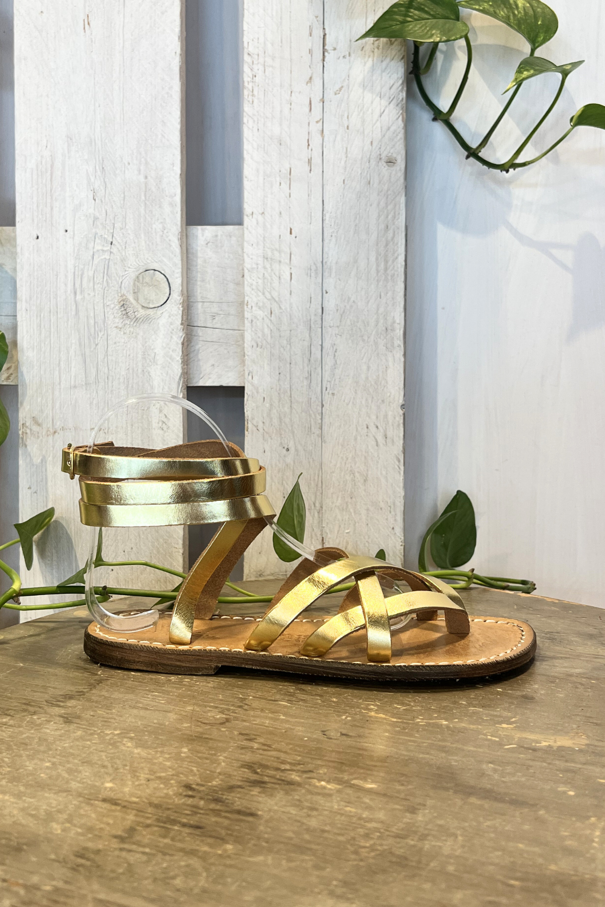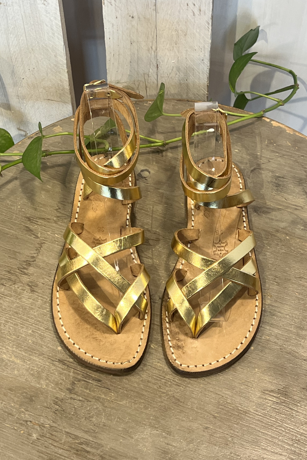 Sandalo infradito in cuoio con fasciette intrecciate sul davanti e allacciatura alla caviglia. Dettaglio suola effetto vintage/graffiata voluto come antiscivolo. Fatto a mano artigianalmente a Firenze (Italia). Calzata regolare. Composizione 100% cuoio