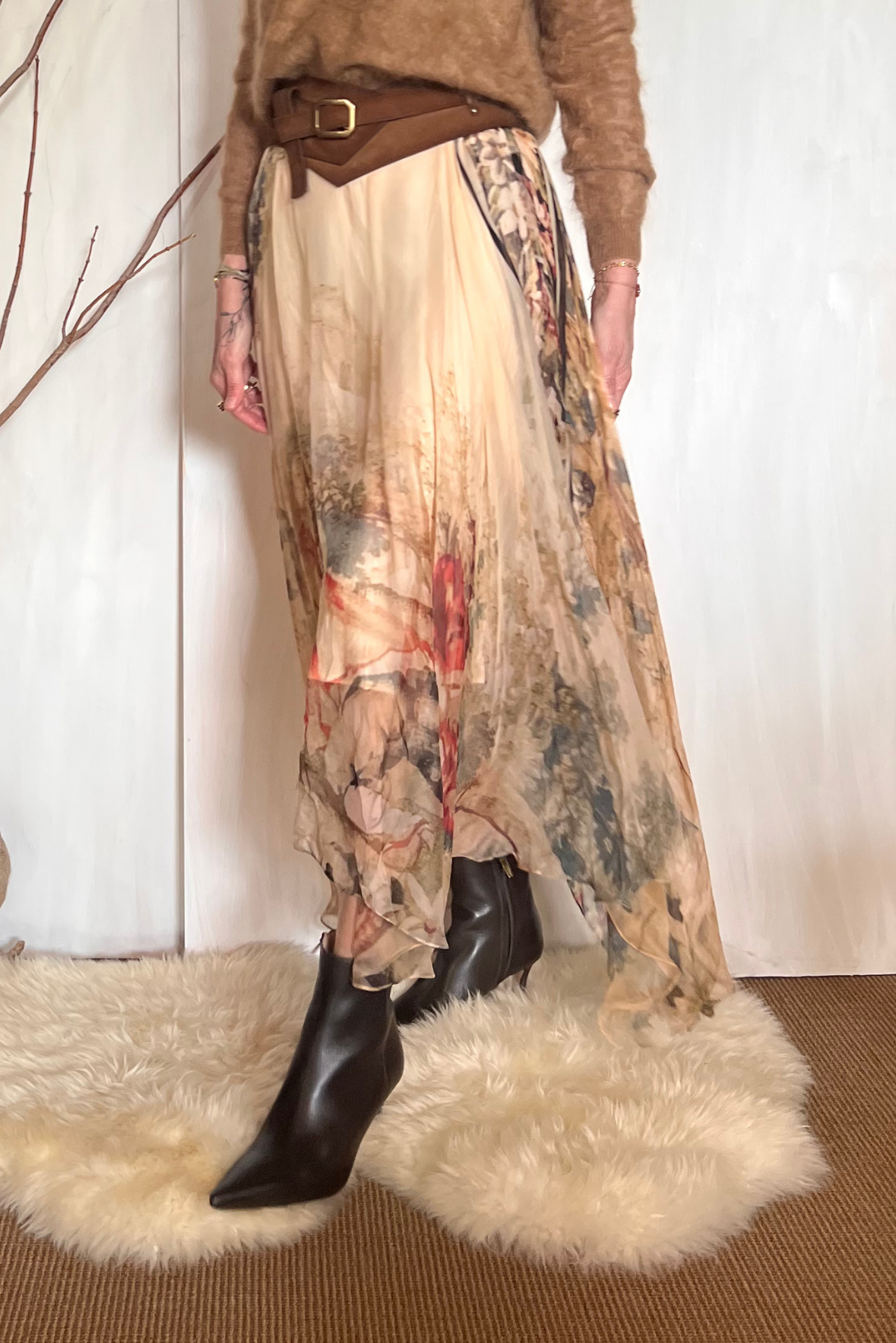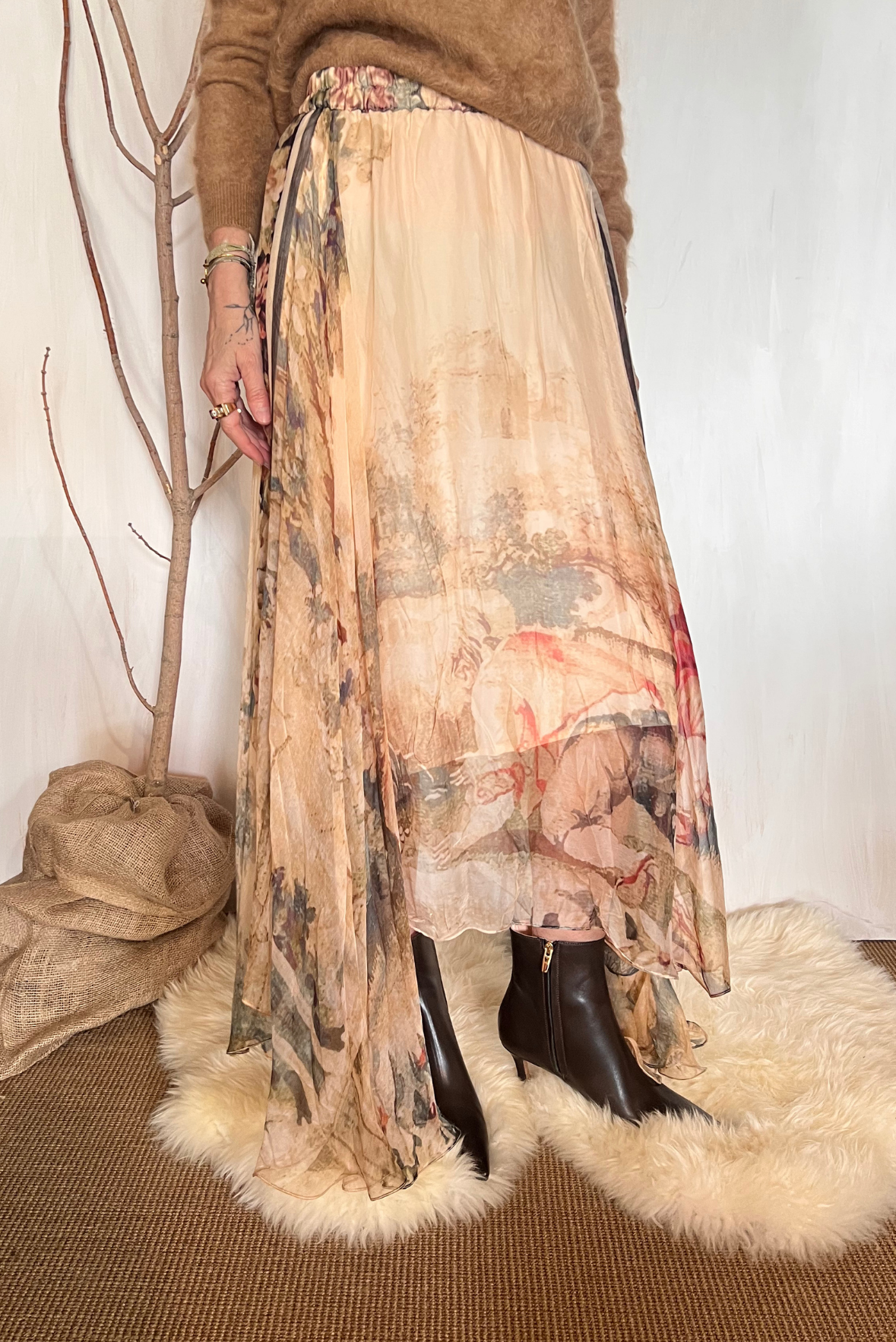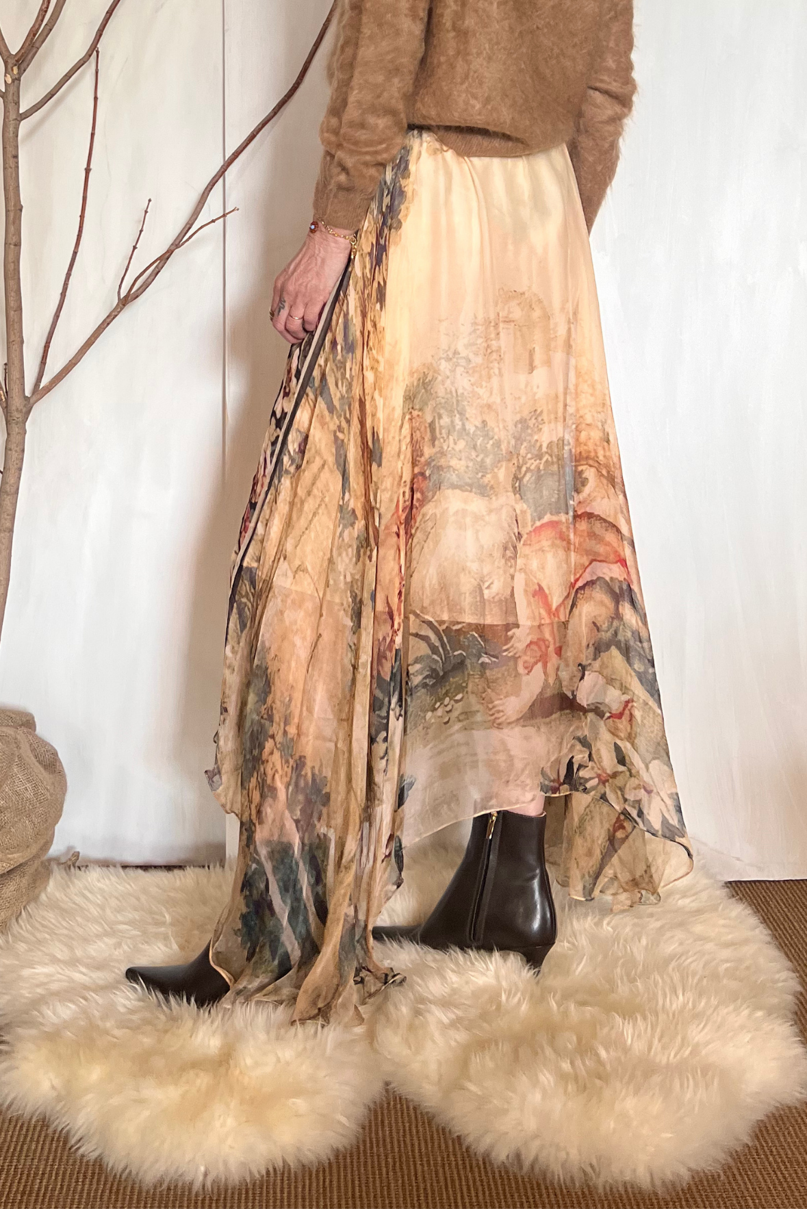 Gonna lunga in viscosa a fantasia. Elastico in vita. Orlo asimmetrico. Sottoveste interna. Vestibilità morbida (taglia indossata 36FR su una 40IT). Composizione 100% viscosa