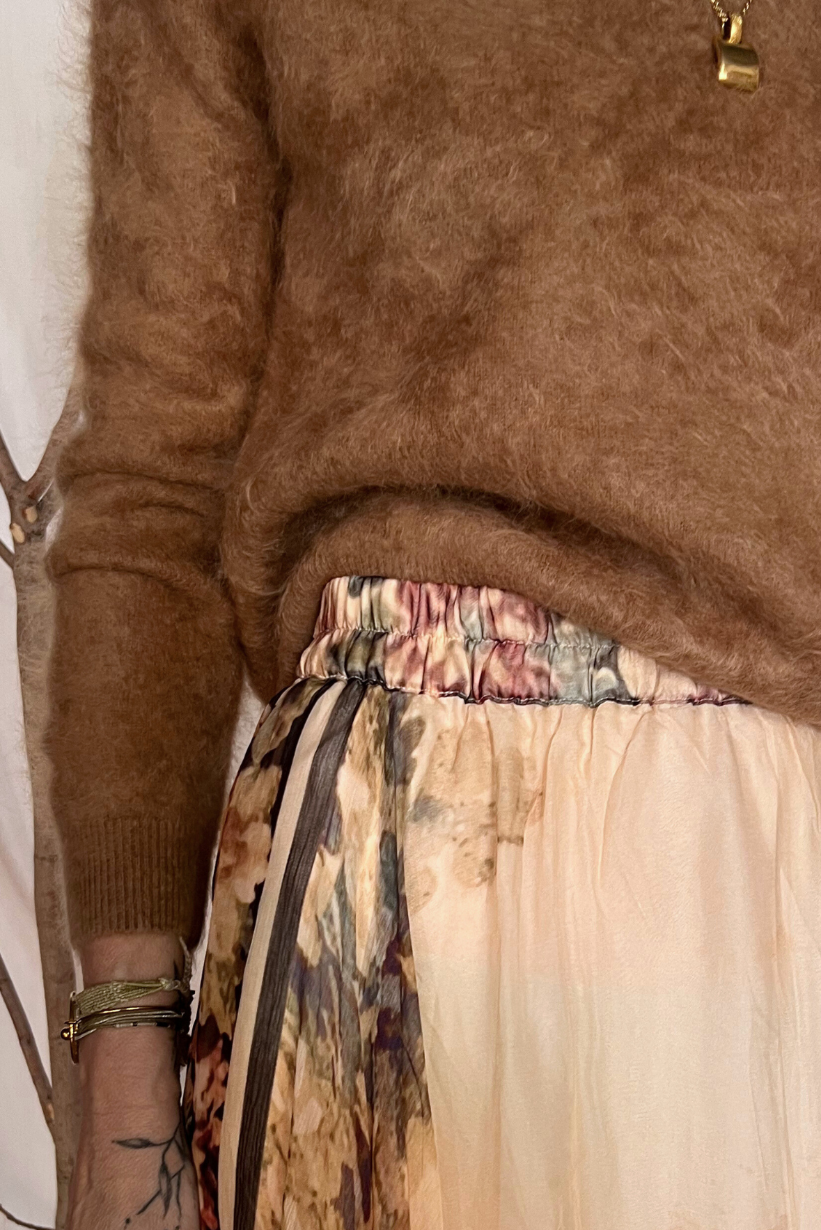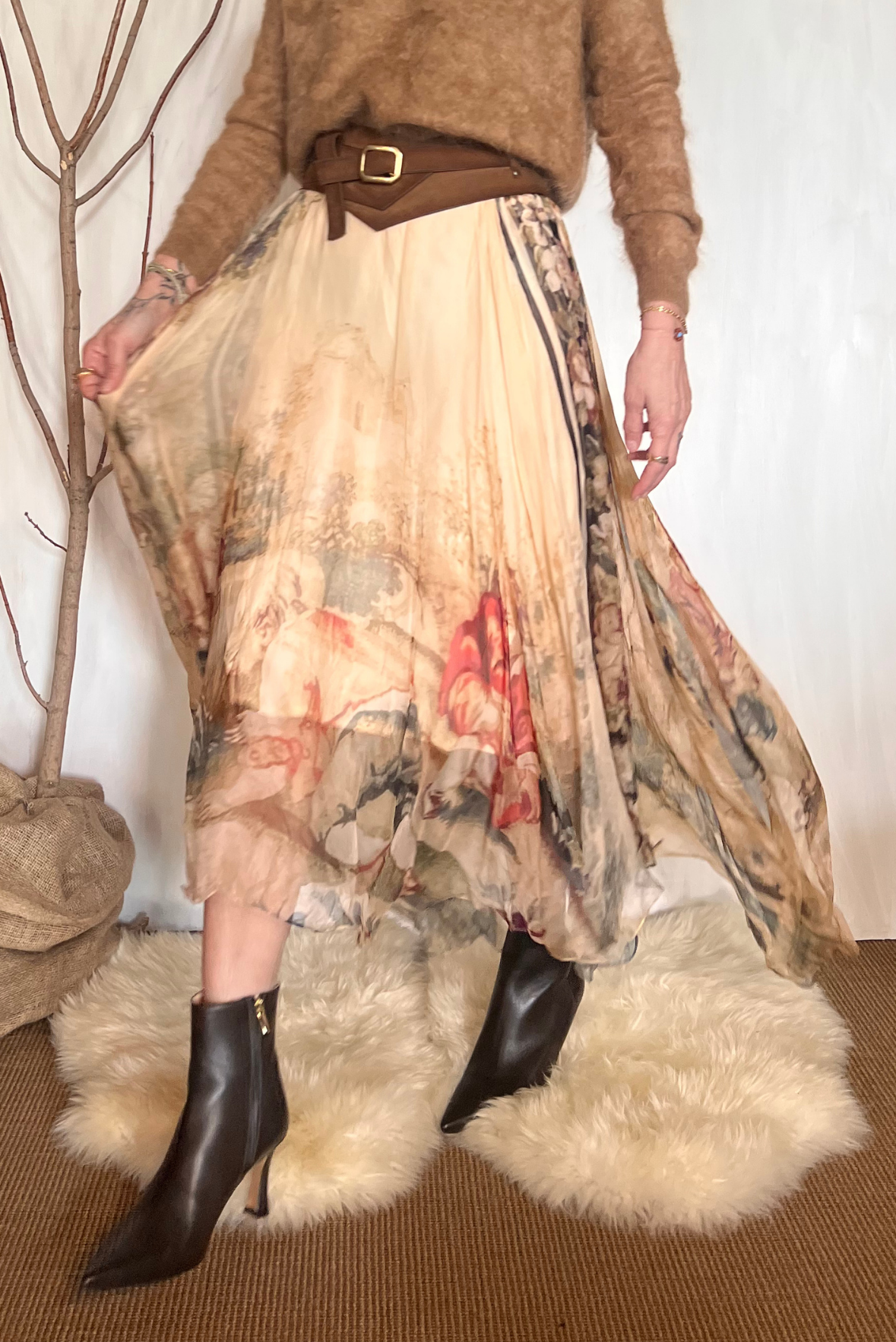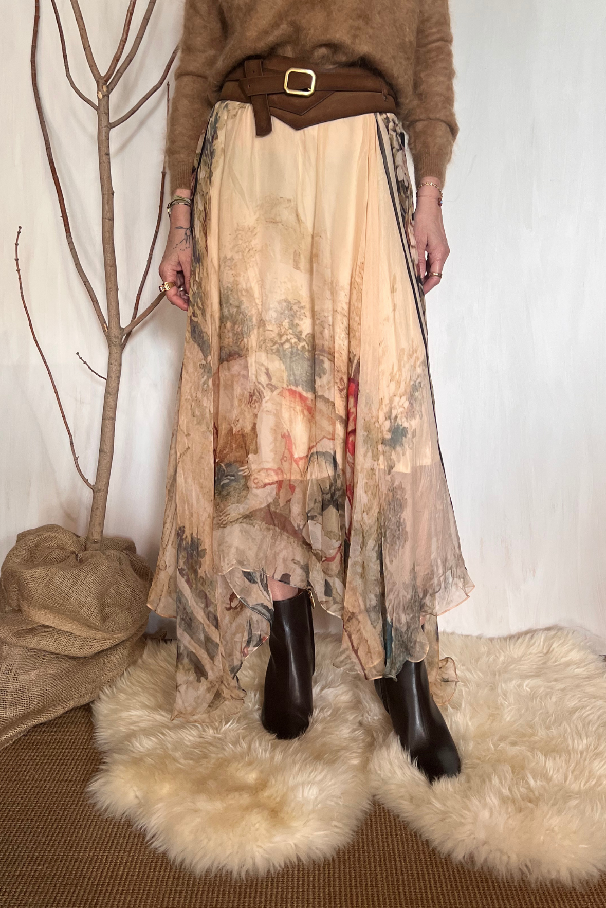 Gonna lunga in viscosa a fantasia. Elastico in vita. Orlo asimmetrico. Sottoveste interna. Vestibilità morbida (taglia indossata 36FR su una 40IT). Composizione 100% viscosa
