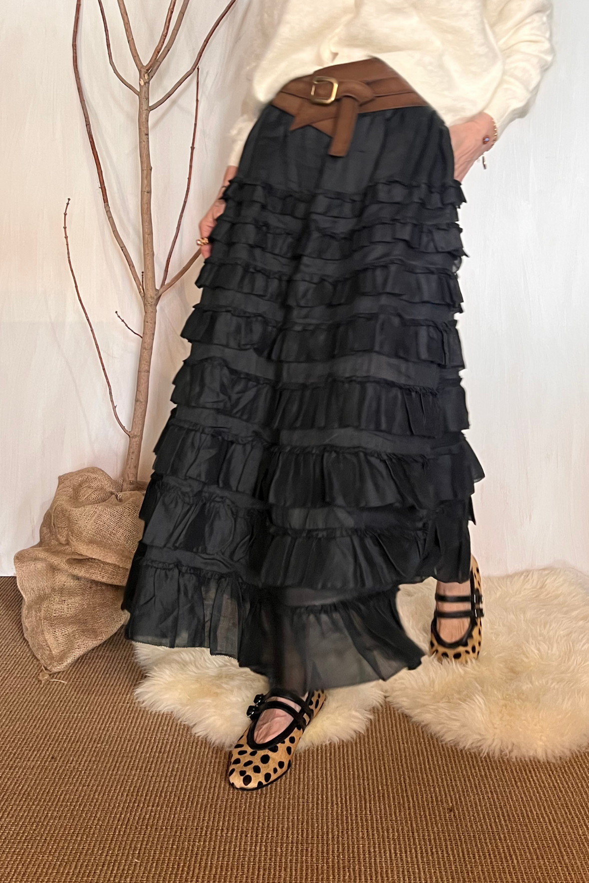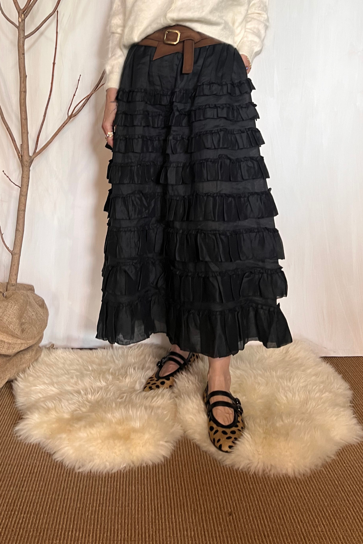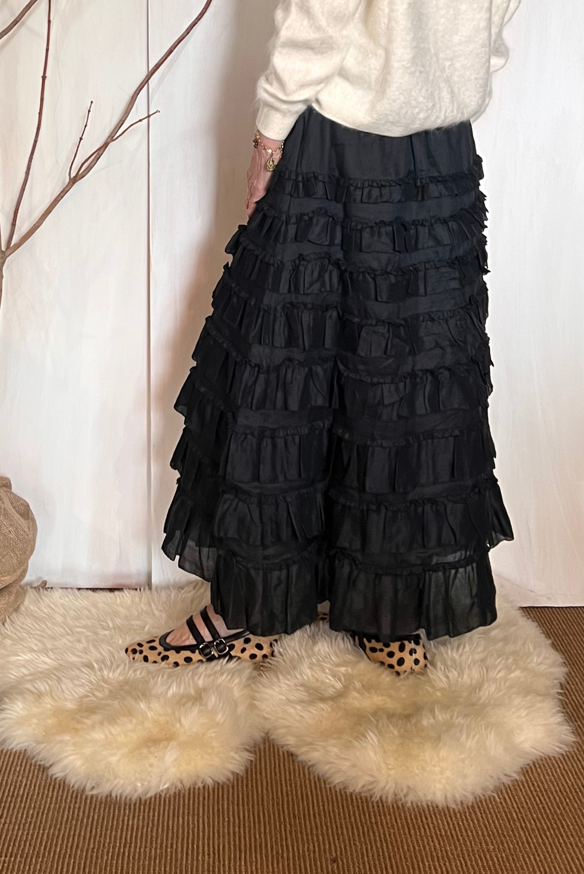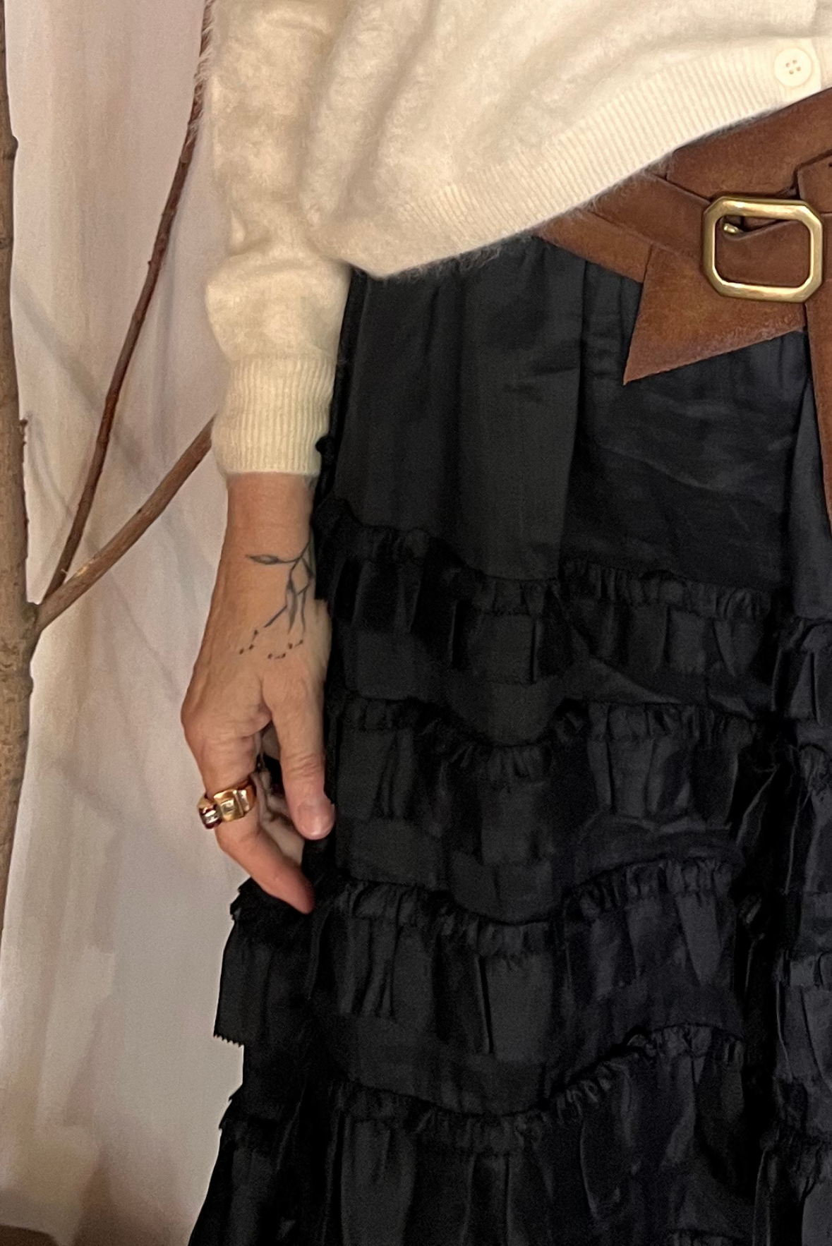 Gonna lunga con balze. Elastico in vita. Sottoveste corta con bottoni automatici (rimovibile). Vestibilità regolare (taglia indossata S su una 40IT). Composizione 100% Ramiè, sottoveste 100% cotone