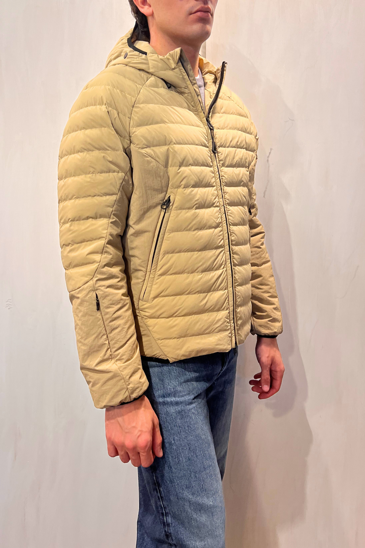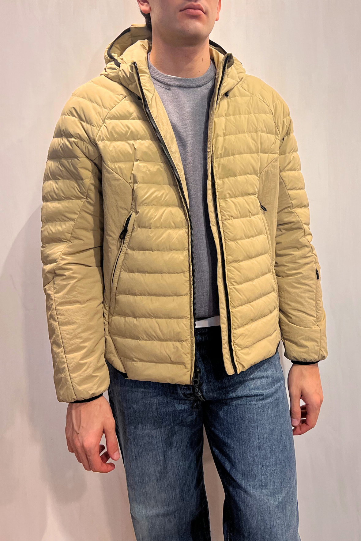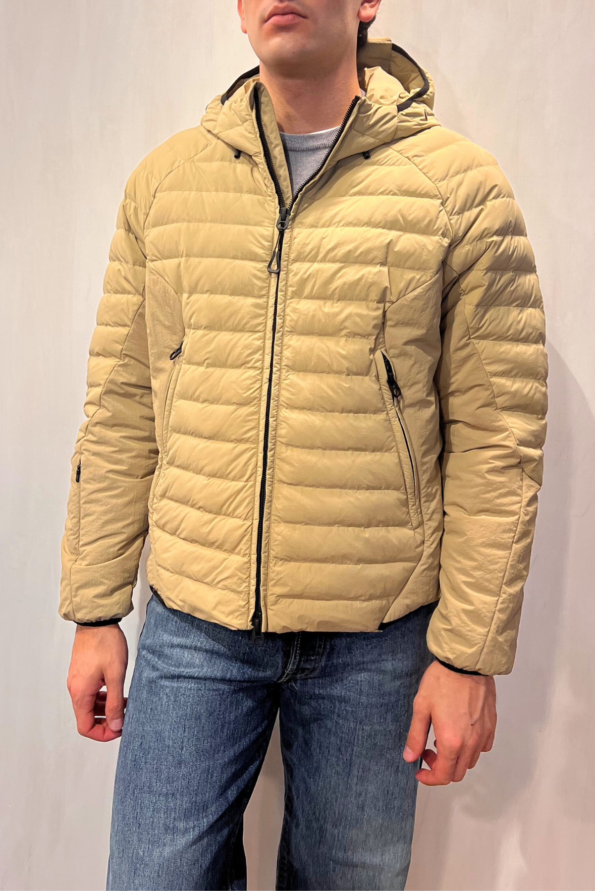 Piumino corto con cappuccio e chiusura con zip tono su tono. Due tasche riscaldate laterali con chiusura zip. Polso elastico. Cappuccio regolabile. Tasca nascosta sul polso destro. Vestibilità regolare. Composizione 100% poliammide