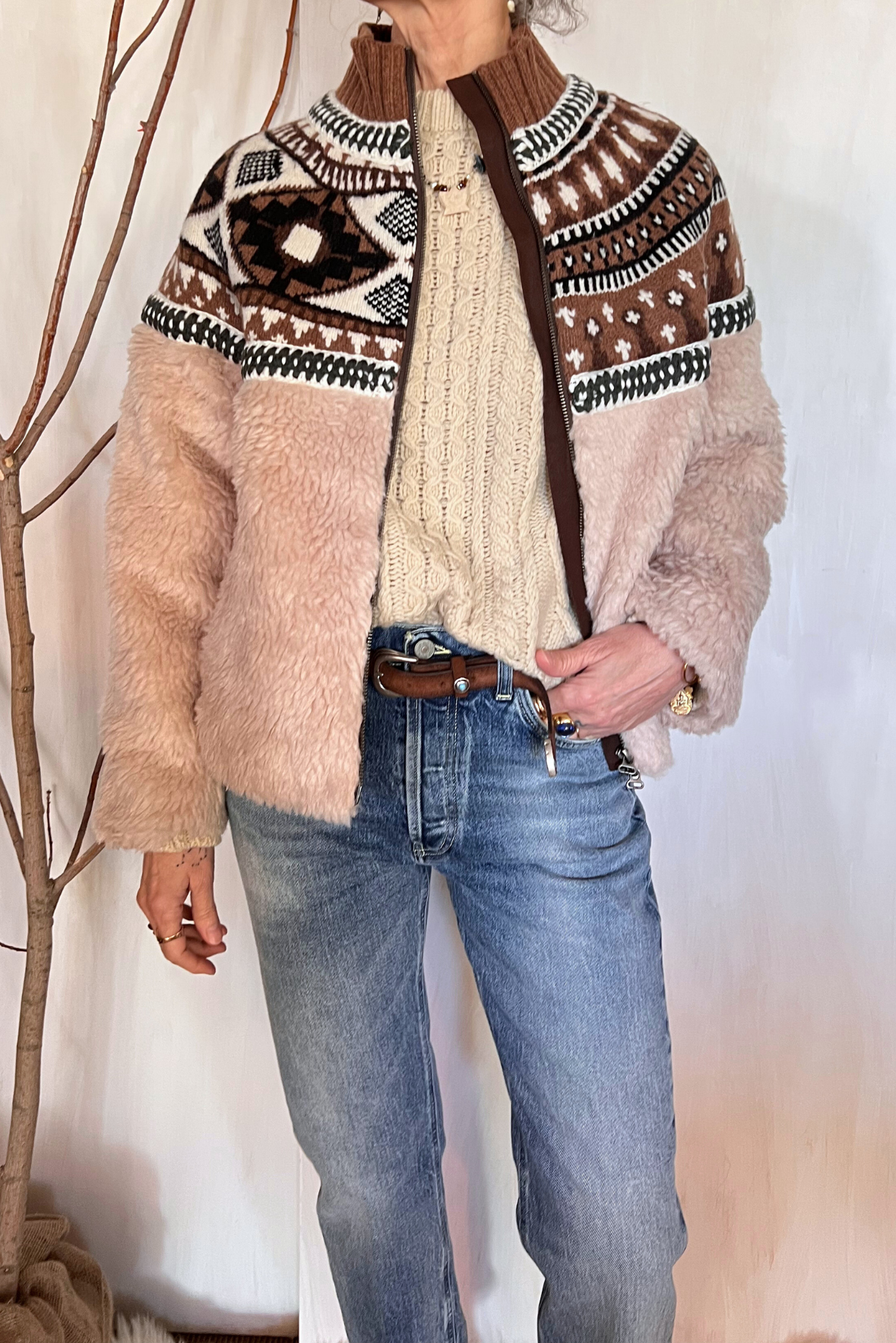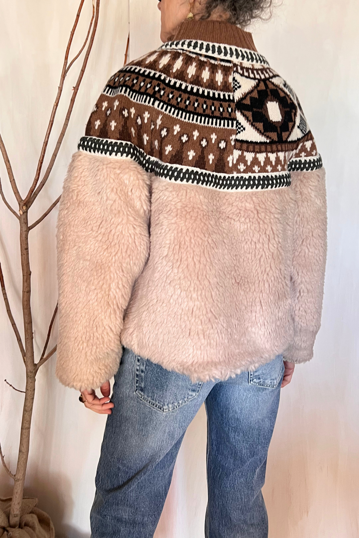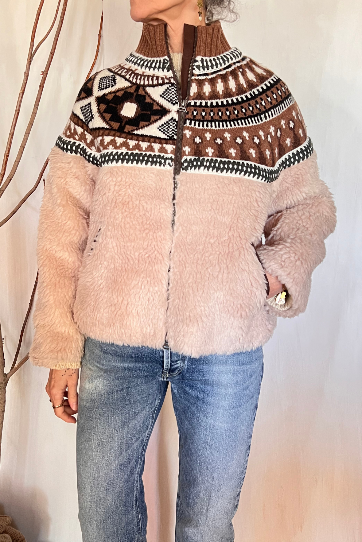 Giubbotto orsetto con motivo jaquard sulle spalle e sul petto. Chiusura con zip e due tasche a scomparsa laterali con profilo a contrasto. Interno foderato. Vestibilità morbida (taglia indossata S su una 40IT). Composizione 100% lana merino extrafine