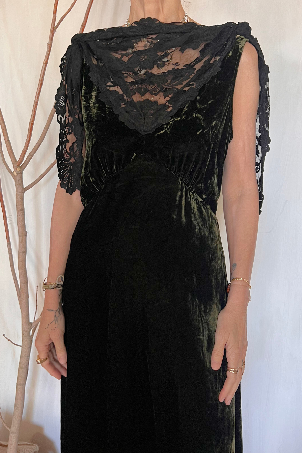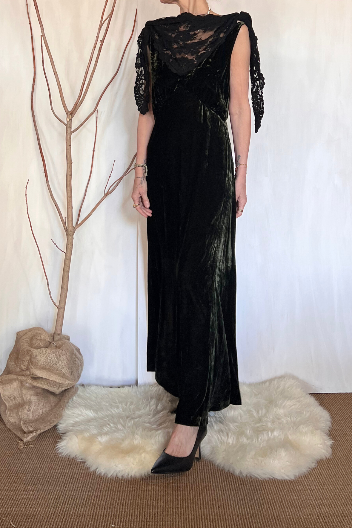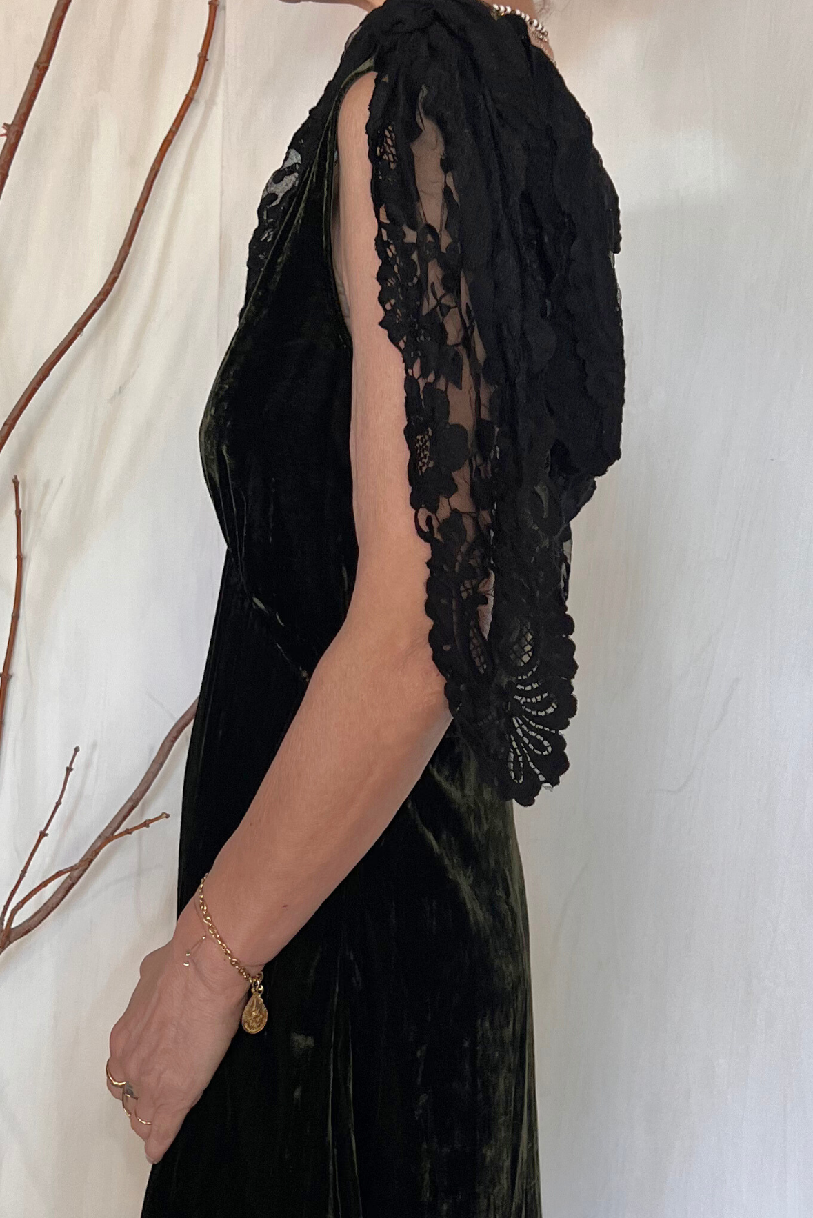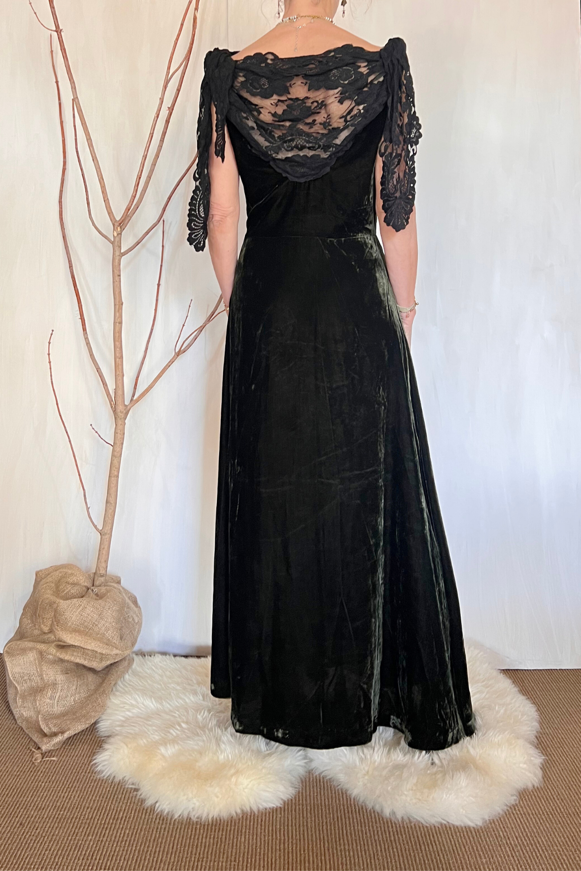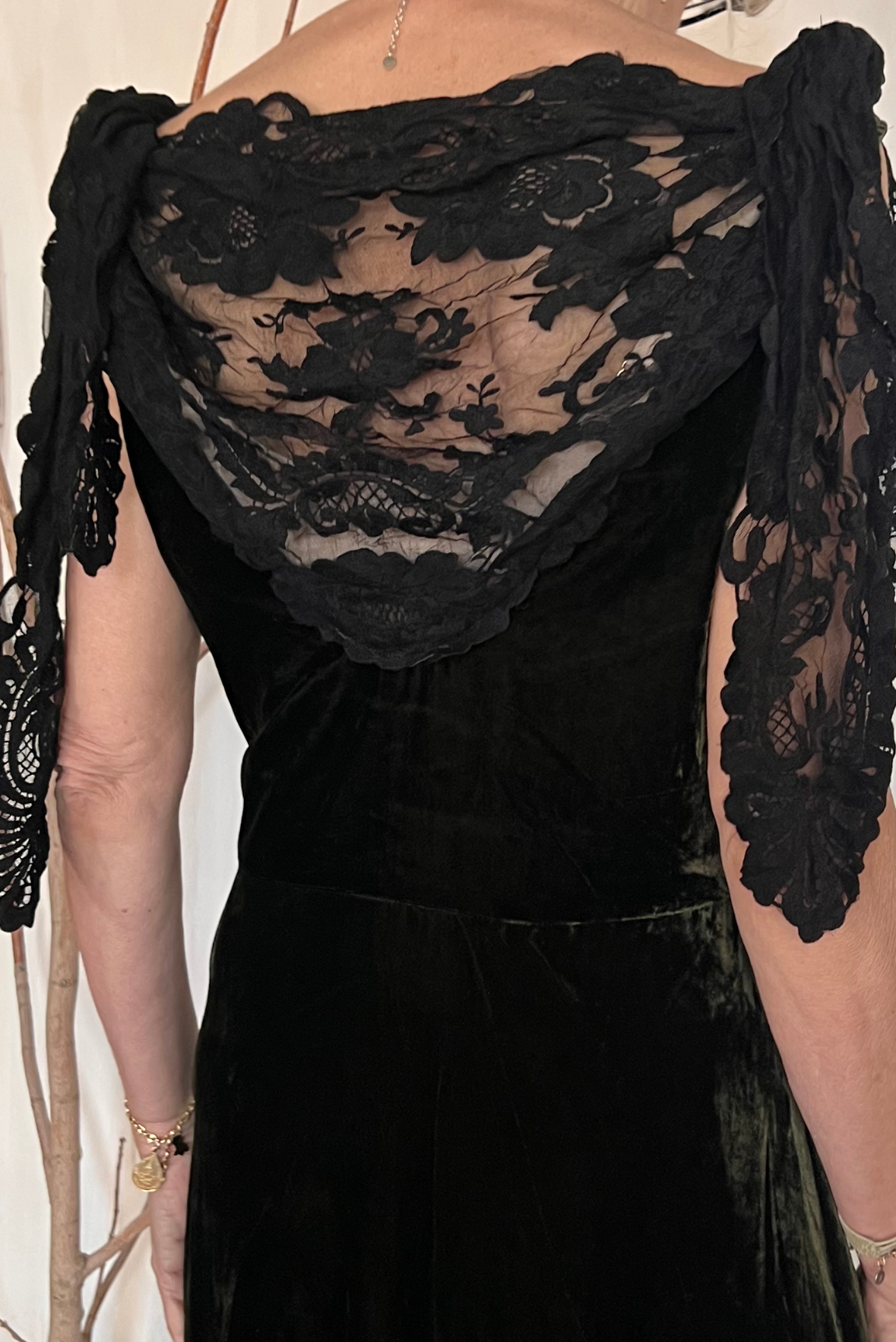 Abito lungo in velluto con dettaglio doppio nodo in pizzo sulle spalle. Chiusura laterale con zip a scomparsa. Gonna leggermente ampia e svasata verso il fondo. Vestibilità regolare (taglia indossata 4 su una 40IT). Composizone 80% viscosa, 20% nylon