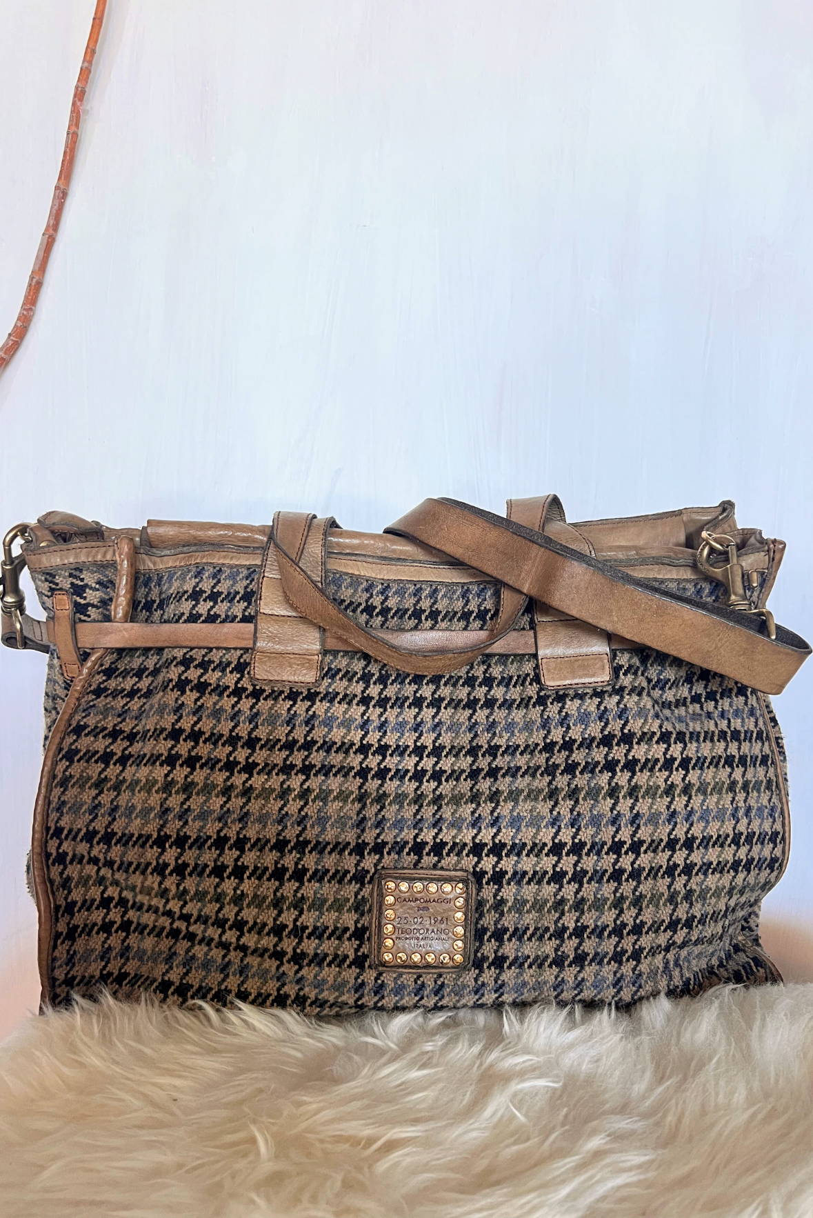 Shopper in pelle e tessuto pied de poule con doppi manici e tracolla regolabile e rimovibile. Chiusura con zip. Interno foderato. Tasca interna con zip e piccola tasca aperta in pelle portacellulare. Dustbag e prodotti per la pulizia della pella inclusi. Misure: base 41cm, altezza 31cm, profondità 14 cm (capienza maggiore in quanto la borsa è in morbida pelle/tessuto).