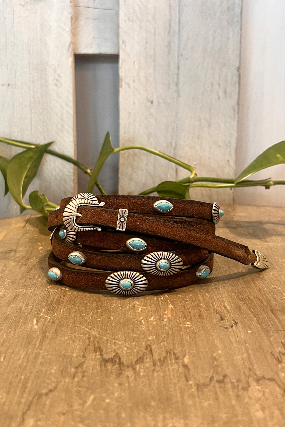 Cintura sottile doppiata in pelle scamosciata con bocchette e turchesi. Misure: altezza 1cm; borchietta 2,5x1,5cm; fibbia 2,5x2cm. Composizione 100% pelle. Made in Italy