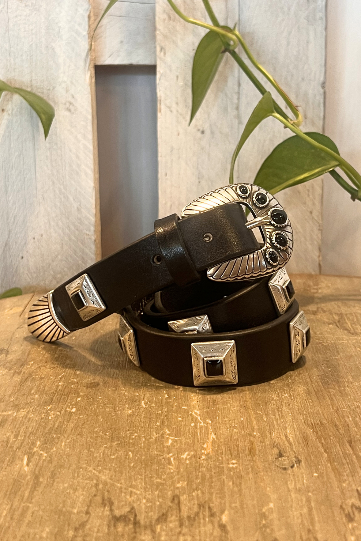 Cintura texana in pelle liscia con borchie e pietre. Misure: altezza 2cm; fibbia 6x5cm. Composizione 100% pelle. Made in Italy