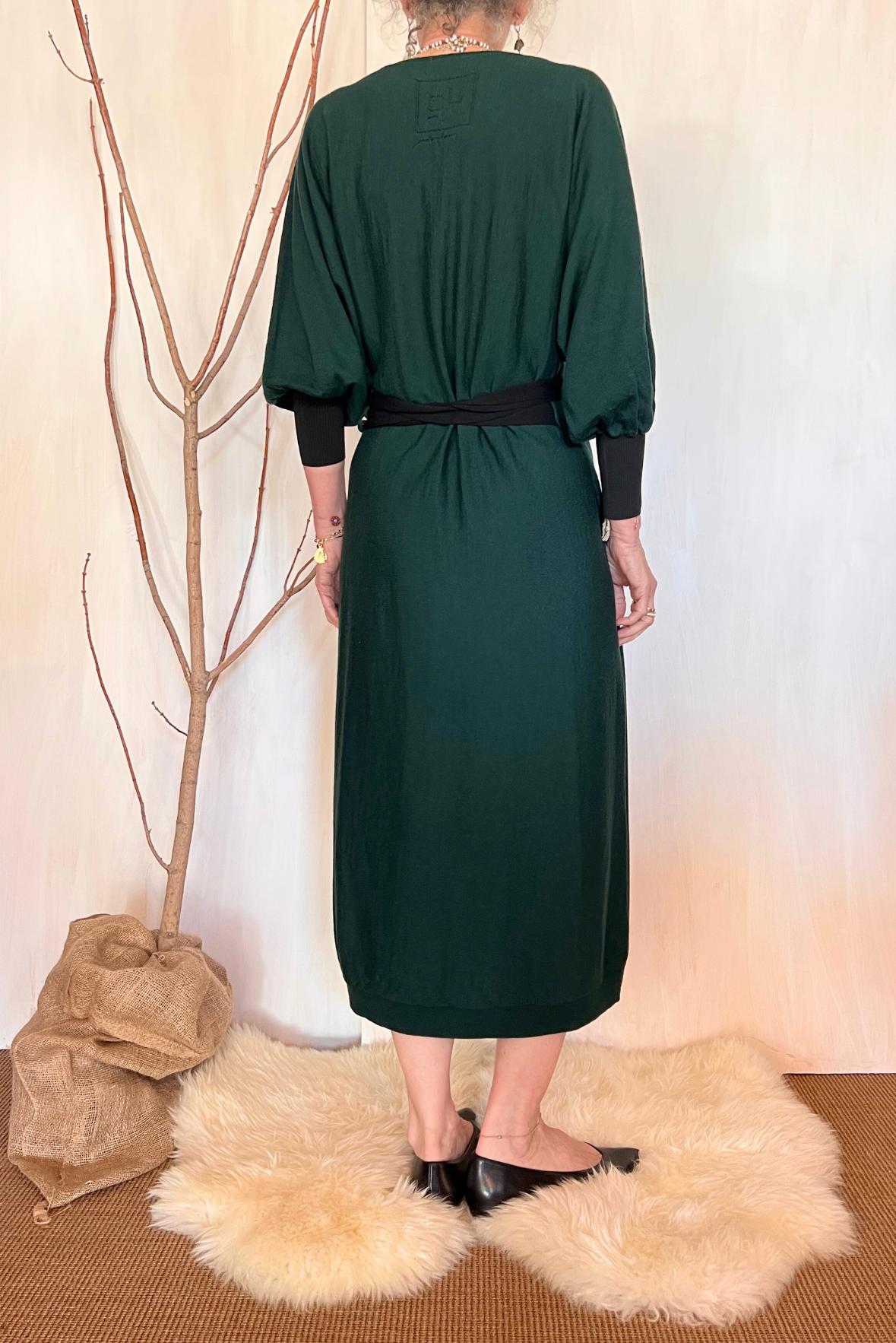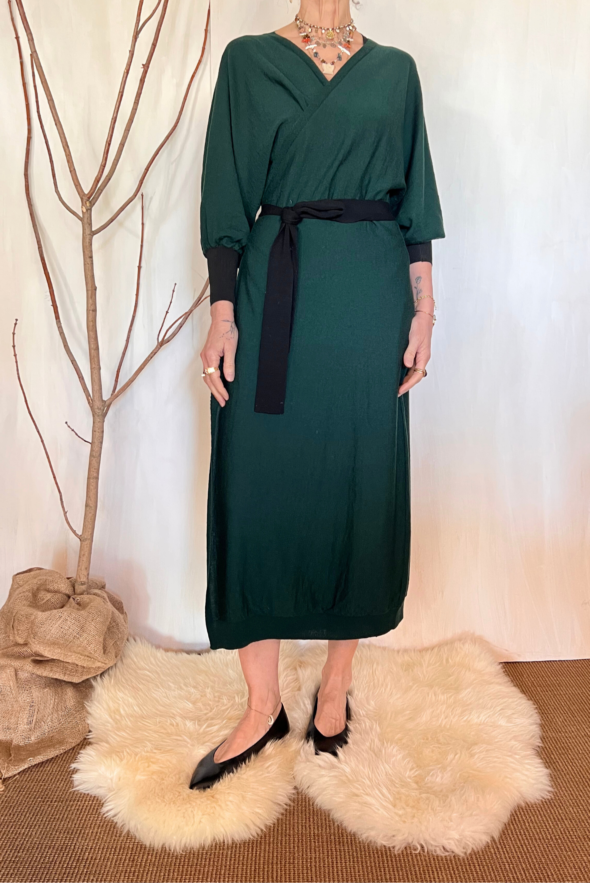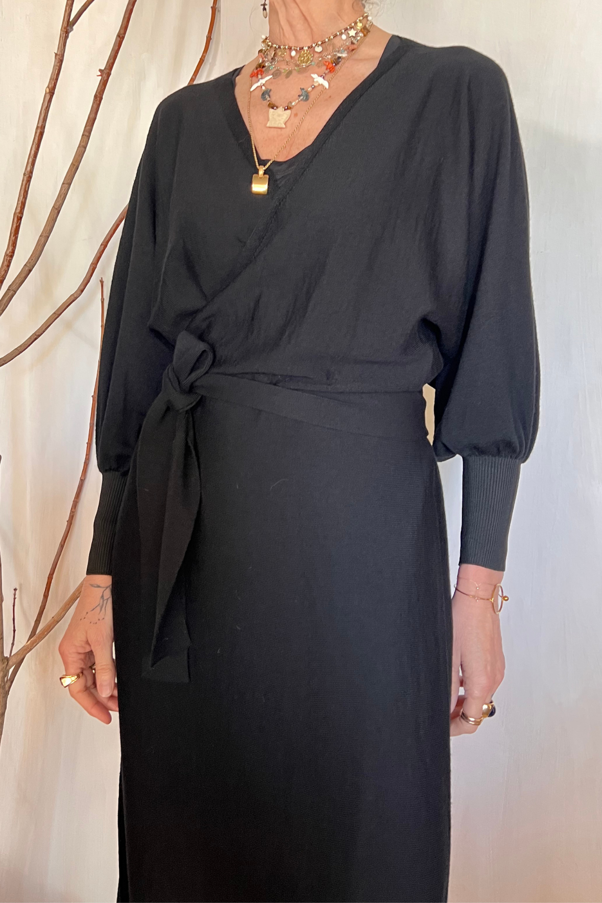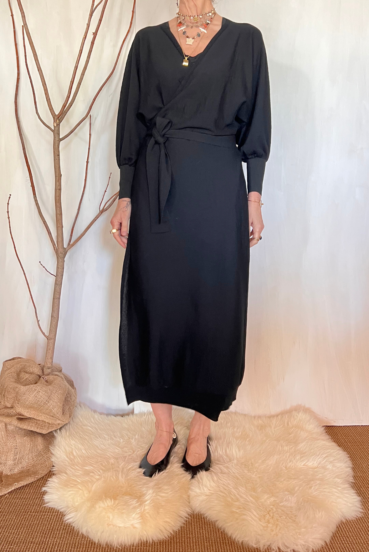 Abito lungo in maglia con incrocio. Dettaglio manica a palloncino e maxi elastico nel polso. Si può indossare anche come maxi cardigan. Vestibilità regolare (taglia indossata 3 su una 40IT che veste fino a una 42). Composizione 93% lana merino, 7% poliestere