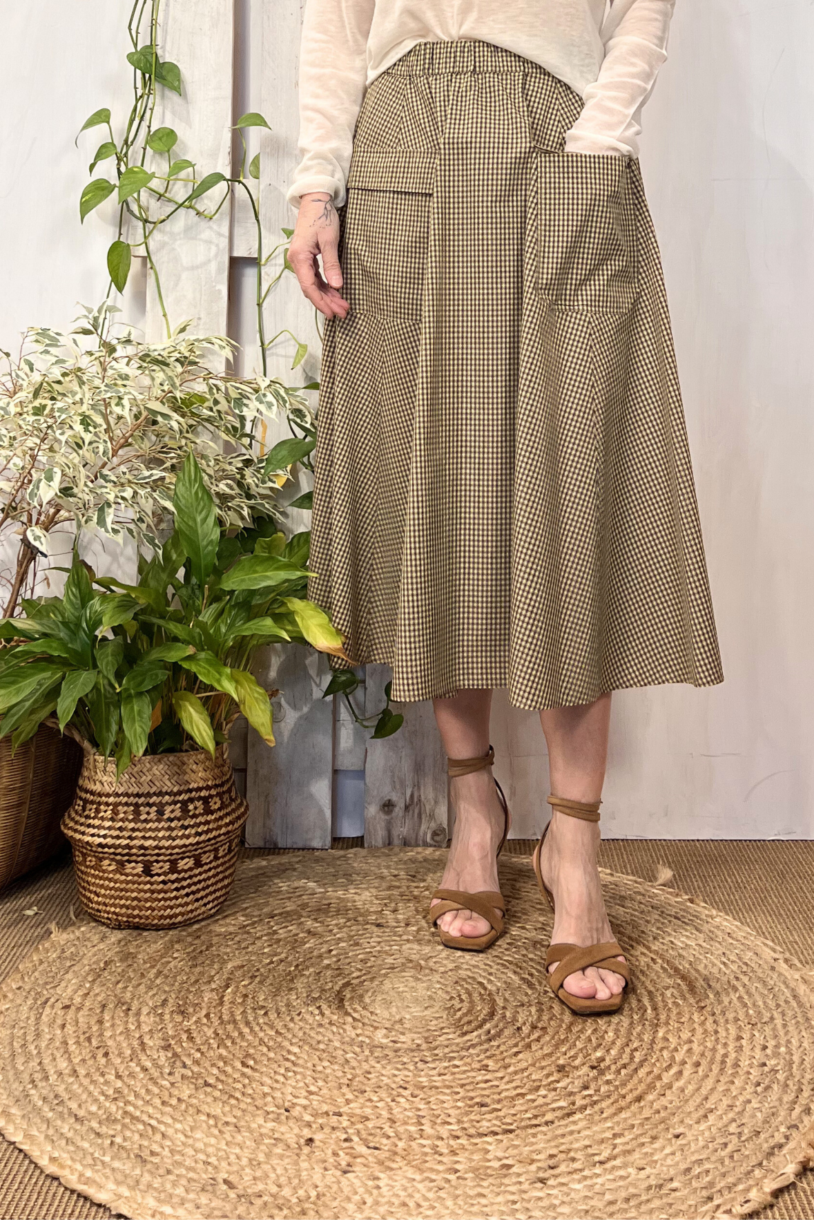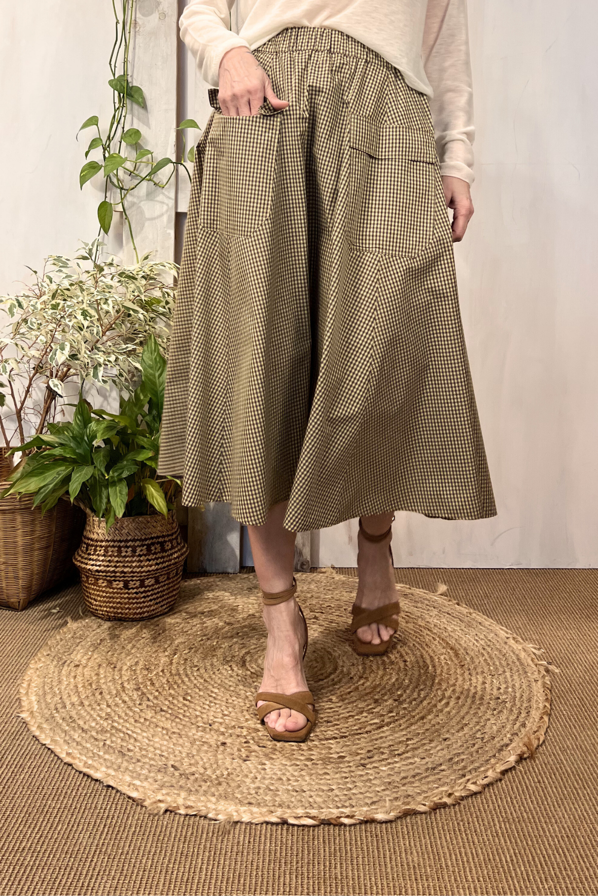 Gonna midi ampia a fantasia Vichy con due tasche applicate sul davanti ed elastico in vita. Vestibilità morbida (taglia indossata 40 su una 40IT). Composizione 55% cotone, 45% poliammide