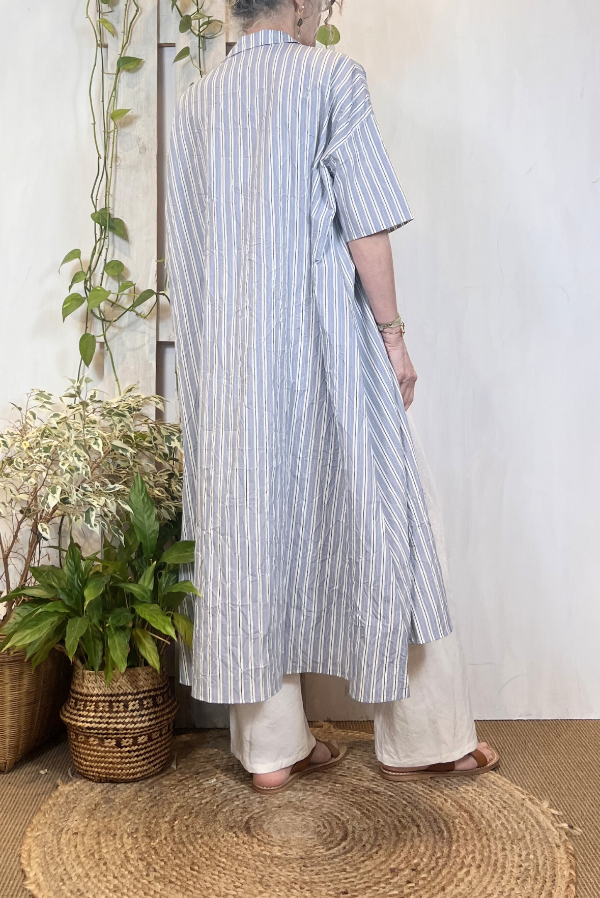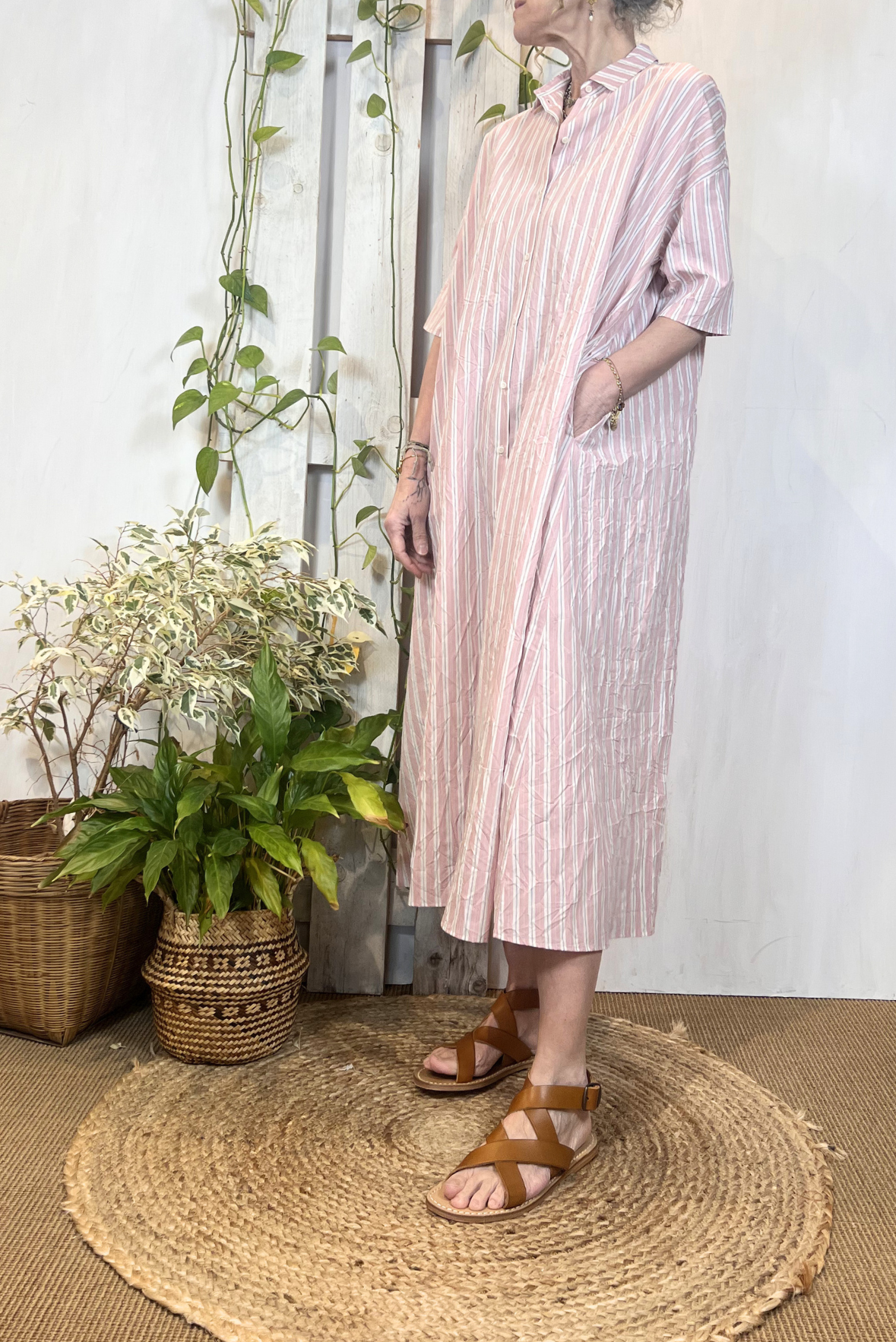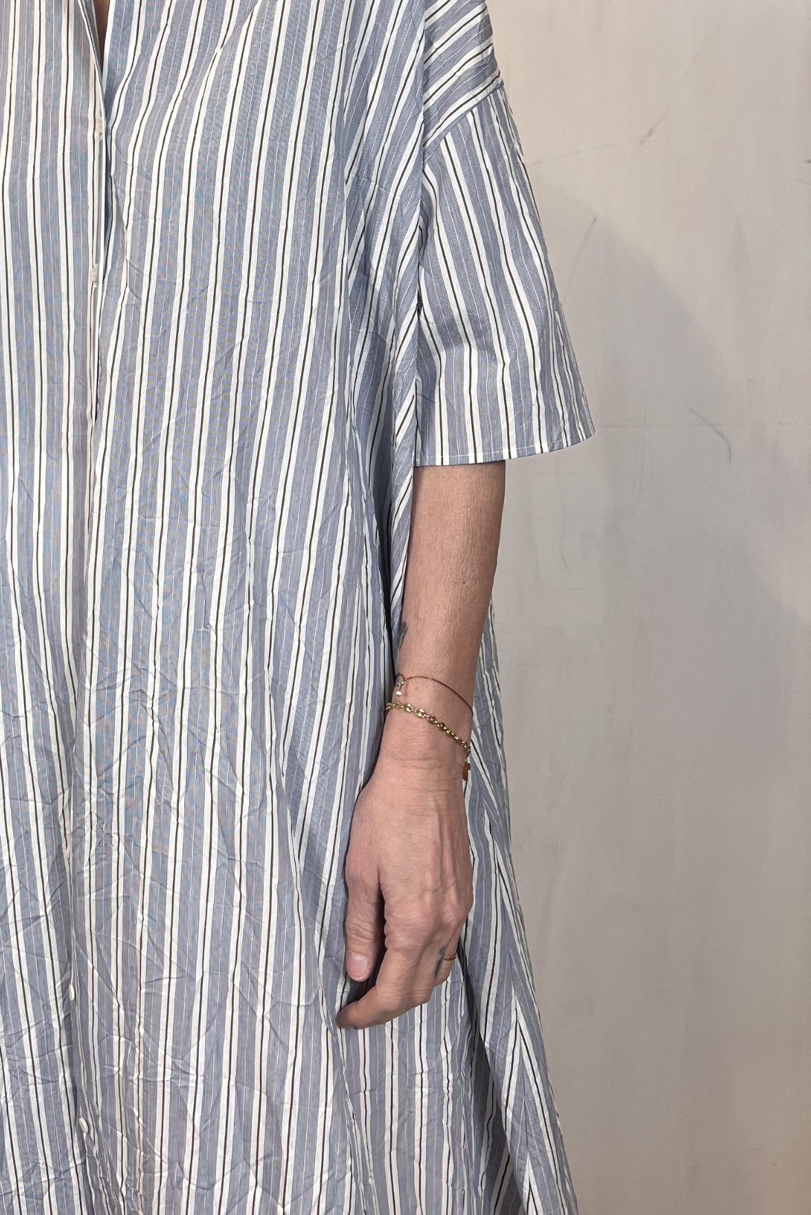 Abito lungo chemisier a maniche corte a fantasia a righe in viscosa increspata (effetto stropicciato). Due tasche laterali a scomparsa. Vestibilità over (Taglia indossata 1 su una 40IT). Composizione 87% viscosa, 13% poliammide