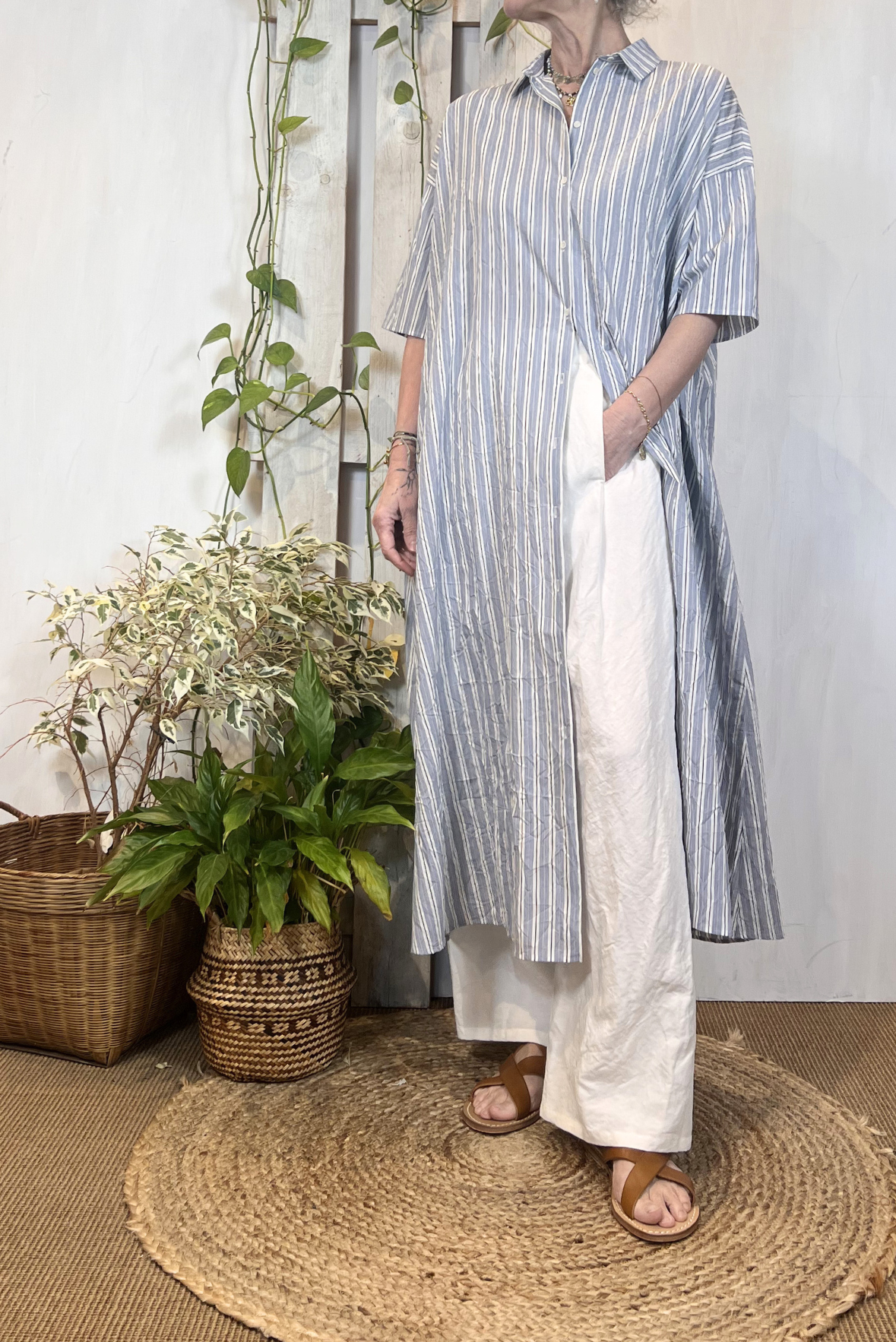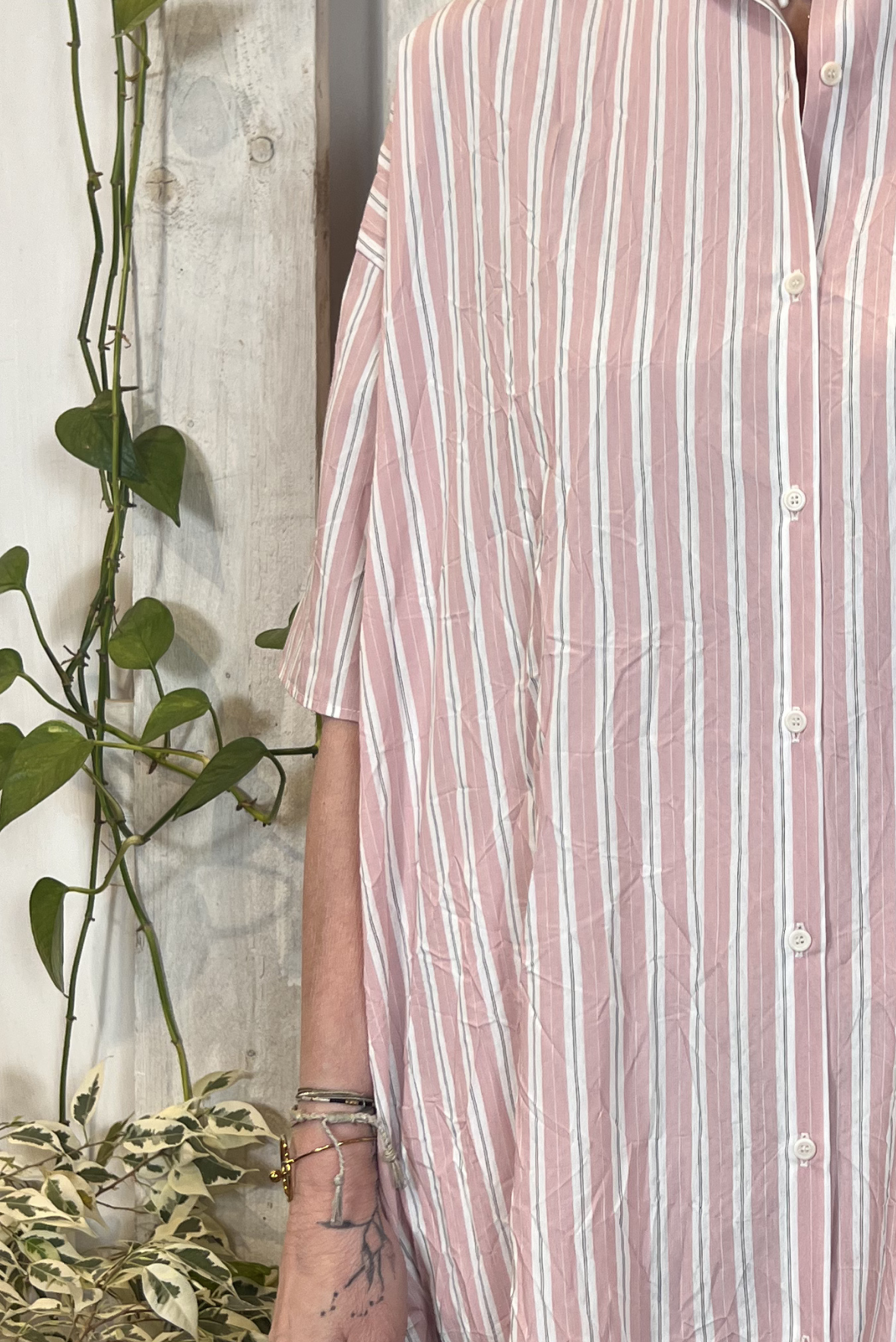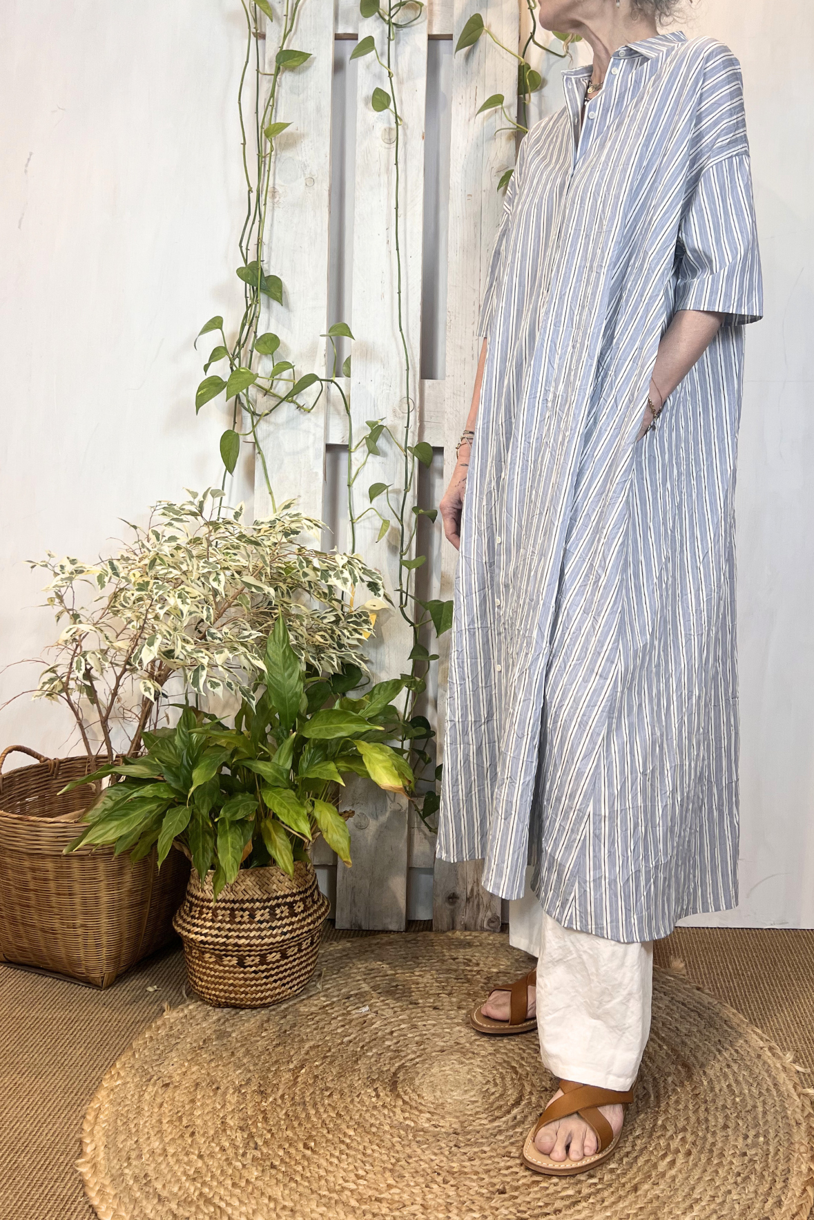 Abito lungo chemisier a maniche corte a fantasia a righe in viscosa increspata (effetto stropicciato). Due tasche laterali a scomparsa. Vestibilità over (Taglia indossata 1 su una 40IT). Composizione 87% viscosa, 13% poliammide
