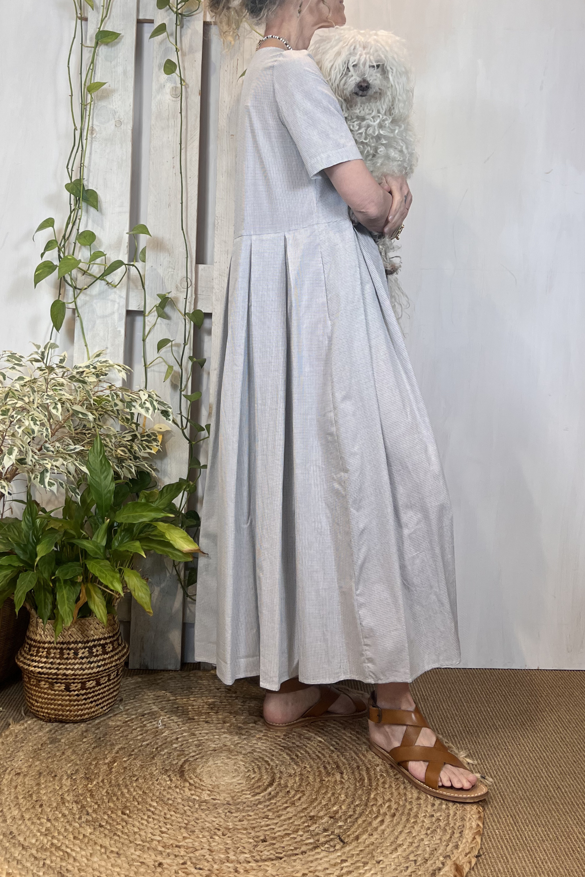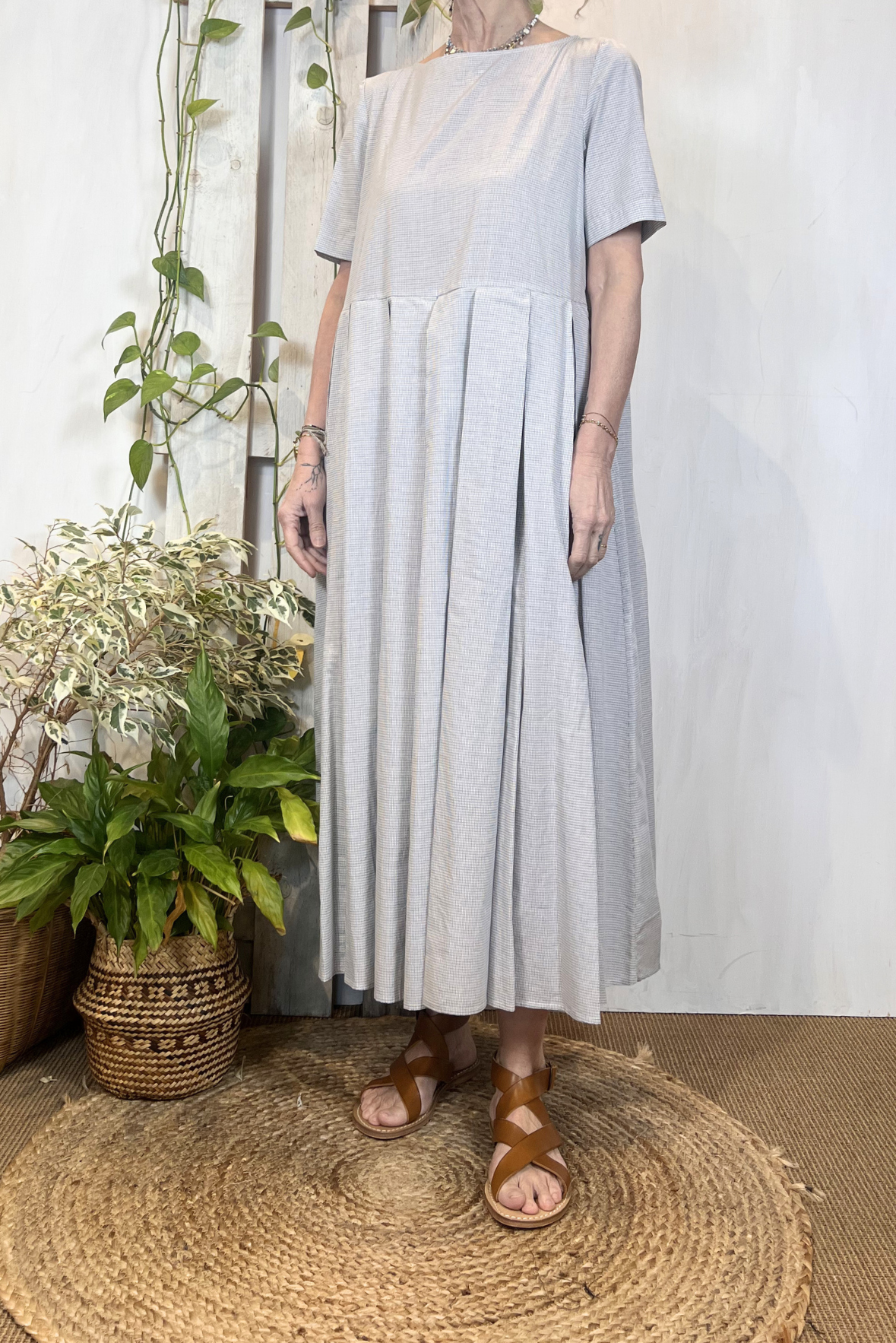 Abito lungo a girocollo e maniche corte in cotone a fantasia quadretti. Gonna ampia con pieghe. Due tasche laterali. Vestibilità morbida (taglia indossata M su una 40IT). Composizione 100% cotone