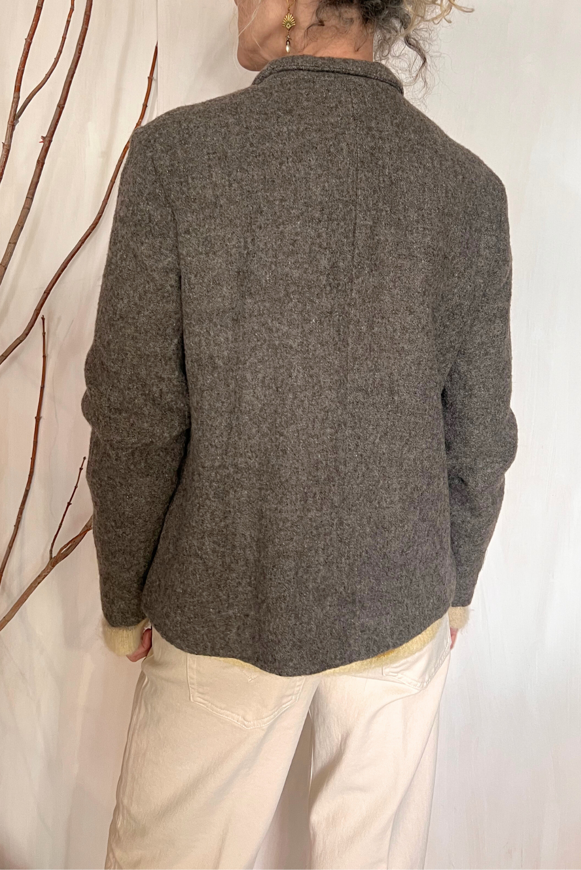 Giacca slim in lana a tinta unita. Chiusura con bottoni. Interno foderato. orlo asimmetrico sul davanti. Vestibilità regolare (taglia indossata S su una 40IT). Composizione 59% lana vergine, 36% lino, 5% poliammide