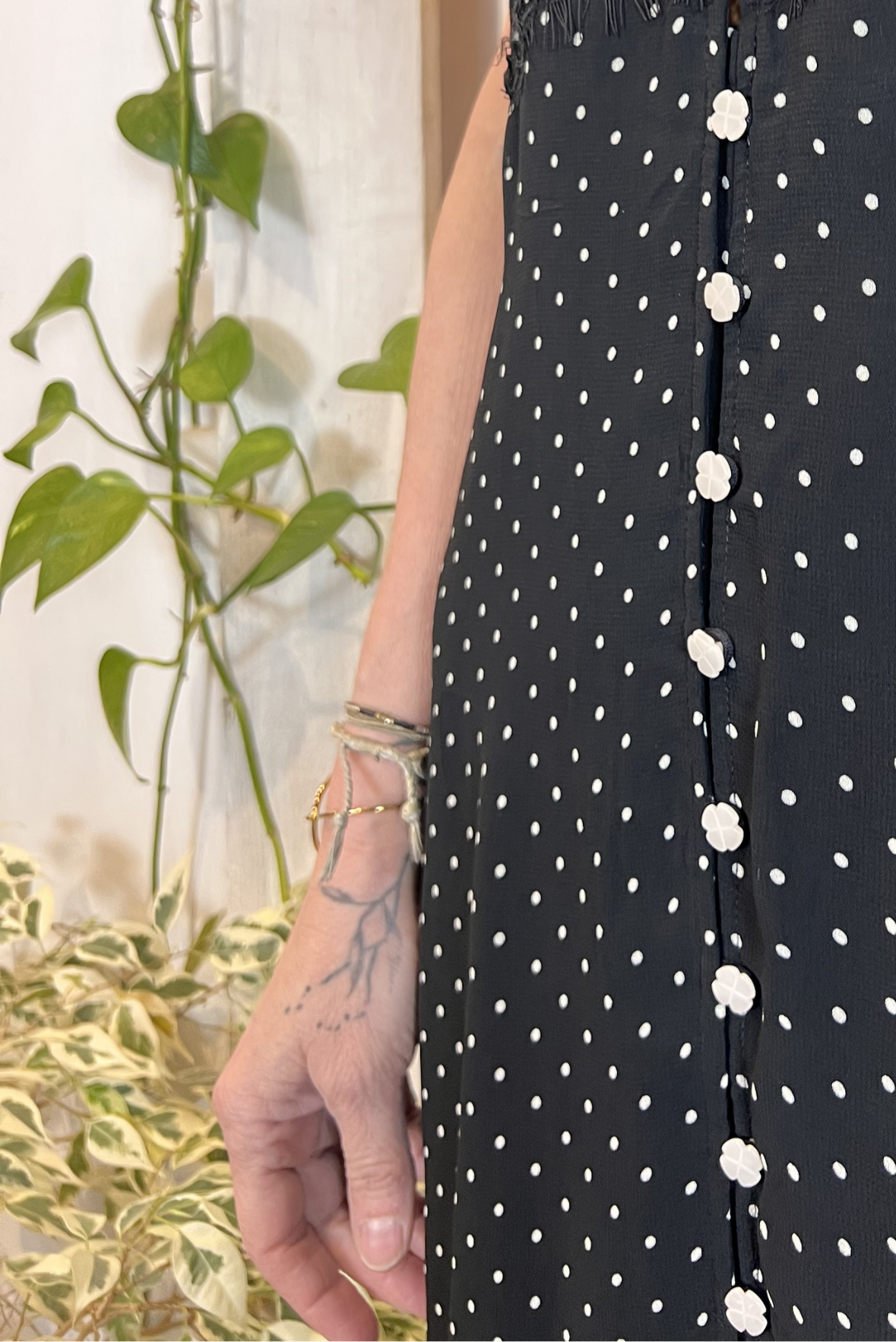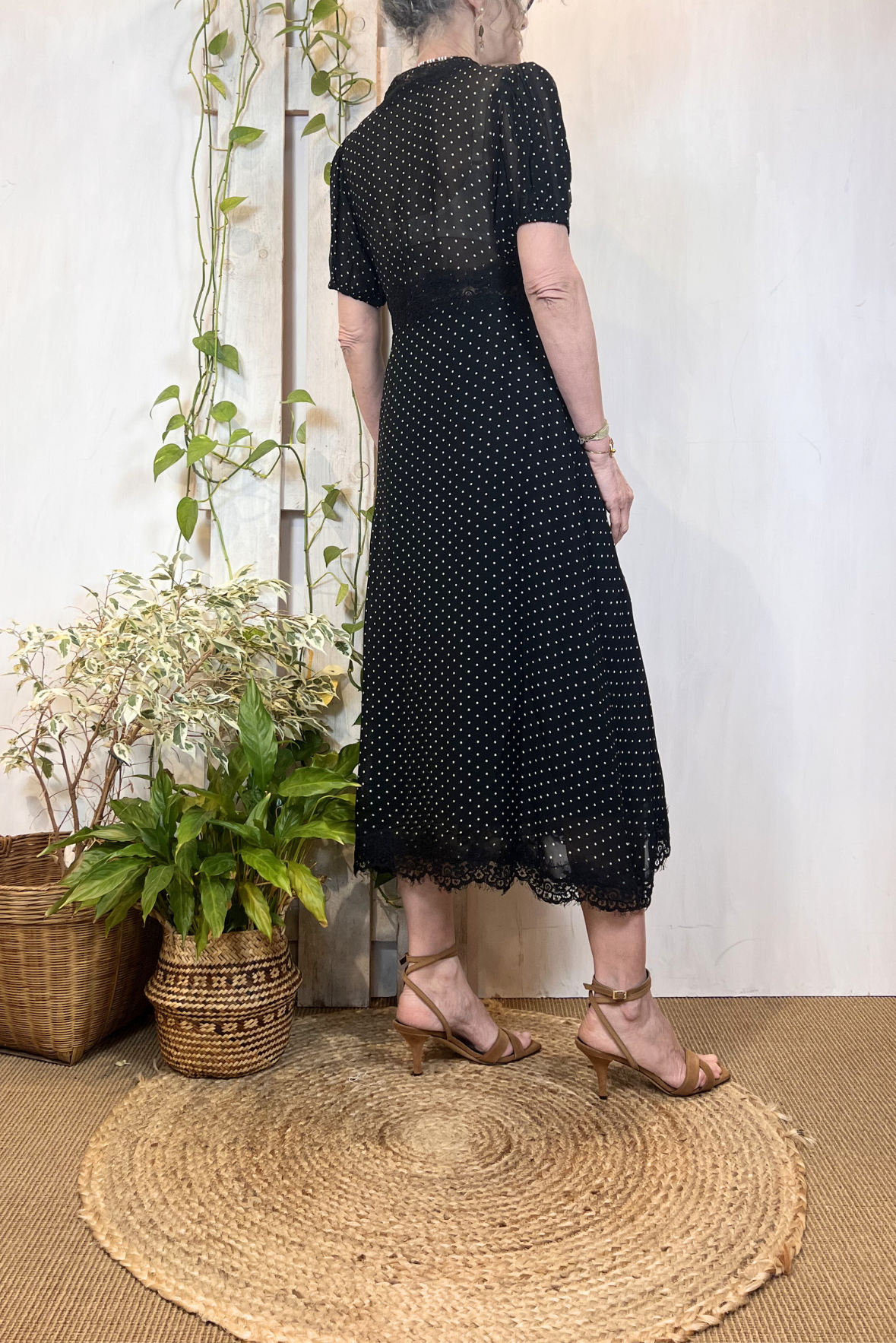 Abito chemisier a manica corta a fantasia pois con dettaglio pizzo e bottoncini in perla suld avanti a forma di quadrifoglio. Maniche con pieghe a palloncino. Gonna con sottoveste. Vestibilità regolare (taglia indossata 2 su una 40IT). Composizione 100% viscosa, fodera 100% cotone