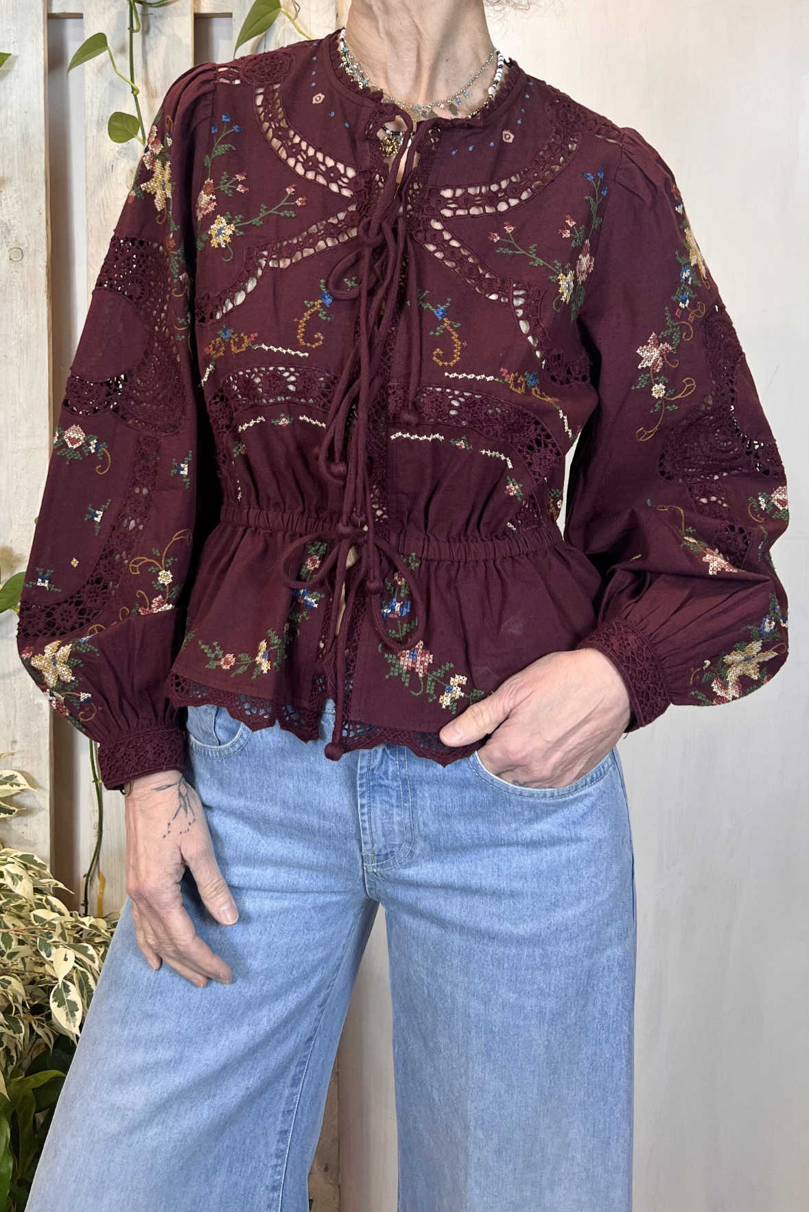 Camicia con ricami e pizzo all over. Dettaglio chiusura sul davanti con laccetti (4 chiusure). Elastico in vita. Maniche a palloncino. Vestibilità morbida (Taglia indossata S su una 40IT). Composizione 89% cotone, 11% flex