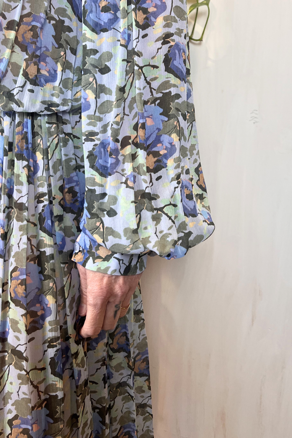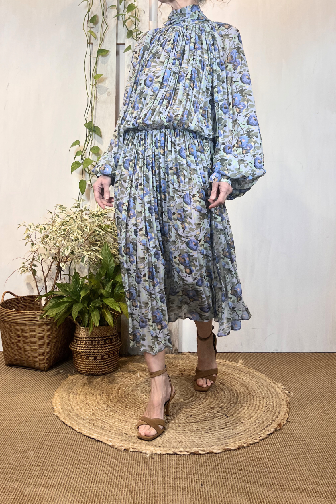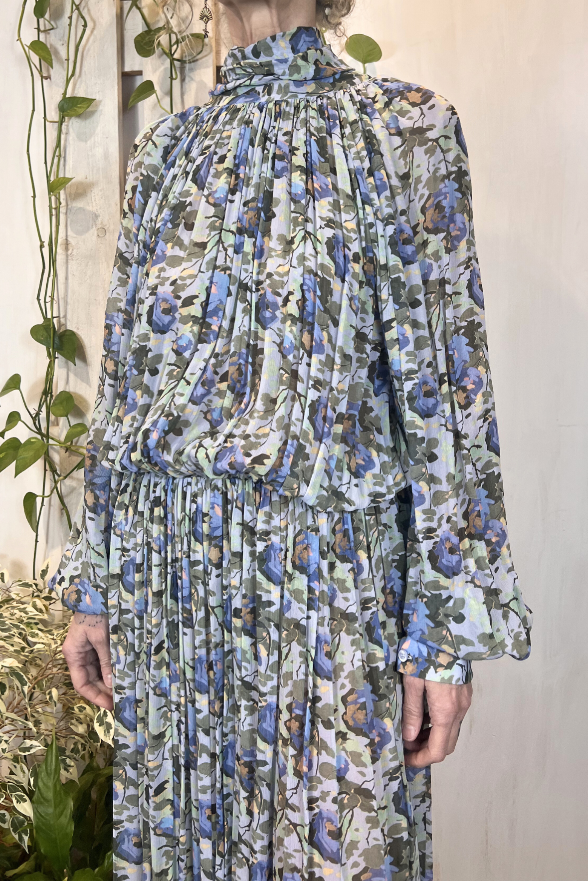 Maxi abito lungo plissettato con maniche ampie a palloncino e maxi scollo nella schiena. Elastico nella parte posteriore. Gonna ampia. Collo alto con bottoni nella parte posteriore. Vestibilità morbida (taglia indossata 40 su una 40IT). Composizione 100% viscosa