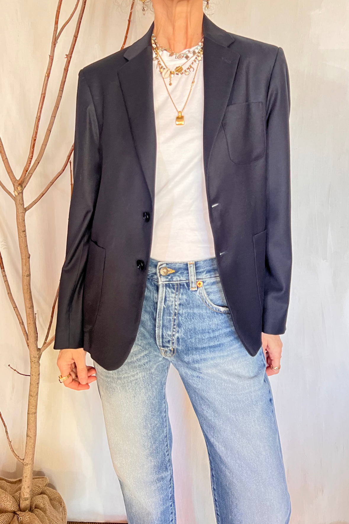 Giacca in lana a un petto. Chiusura a due bottoni. Due tasche applicate sul davanti e una sul petto. Spacco posteriore. Interno foderato a contrasto. Tasca interna. Vestibilità regolare (taglia indossata 40 su una 40IT). Composizione 99% lana, 1% elastan