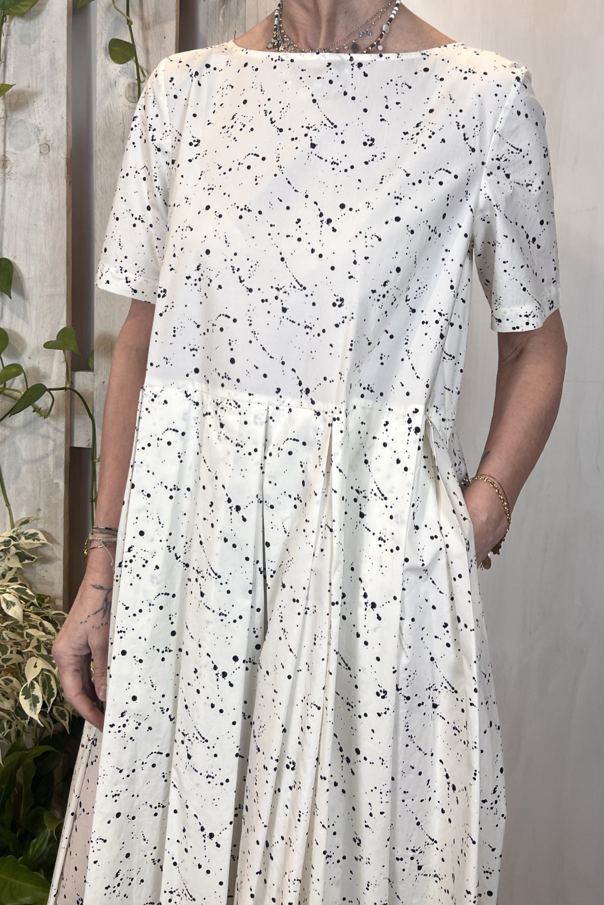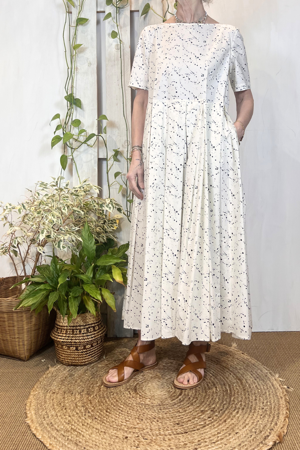 Abito lungo a girocollo e maniche corte in cotone popeline leggero a fantasia. Gonna ampia con pieghe. Due tasche laterali. Vestibilità morbida (taglia indossata S su una 40IT). Composizione 100% cotone