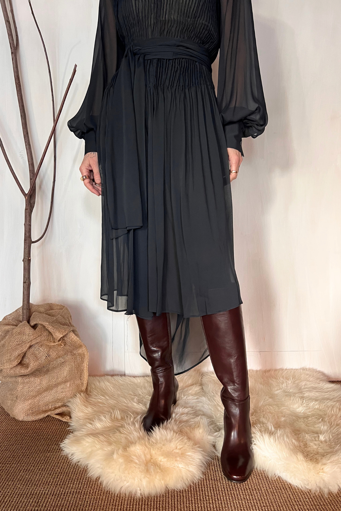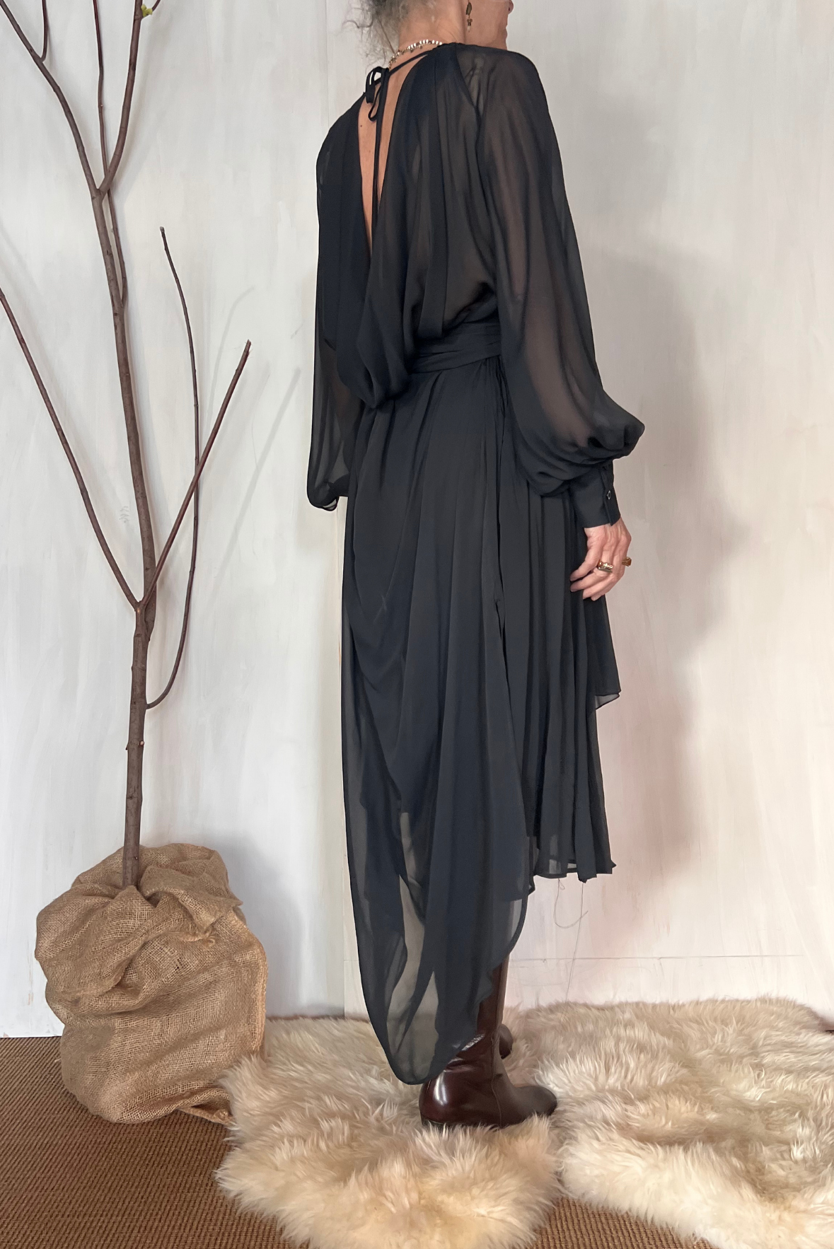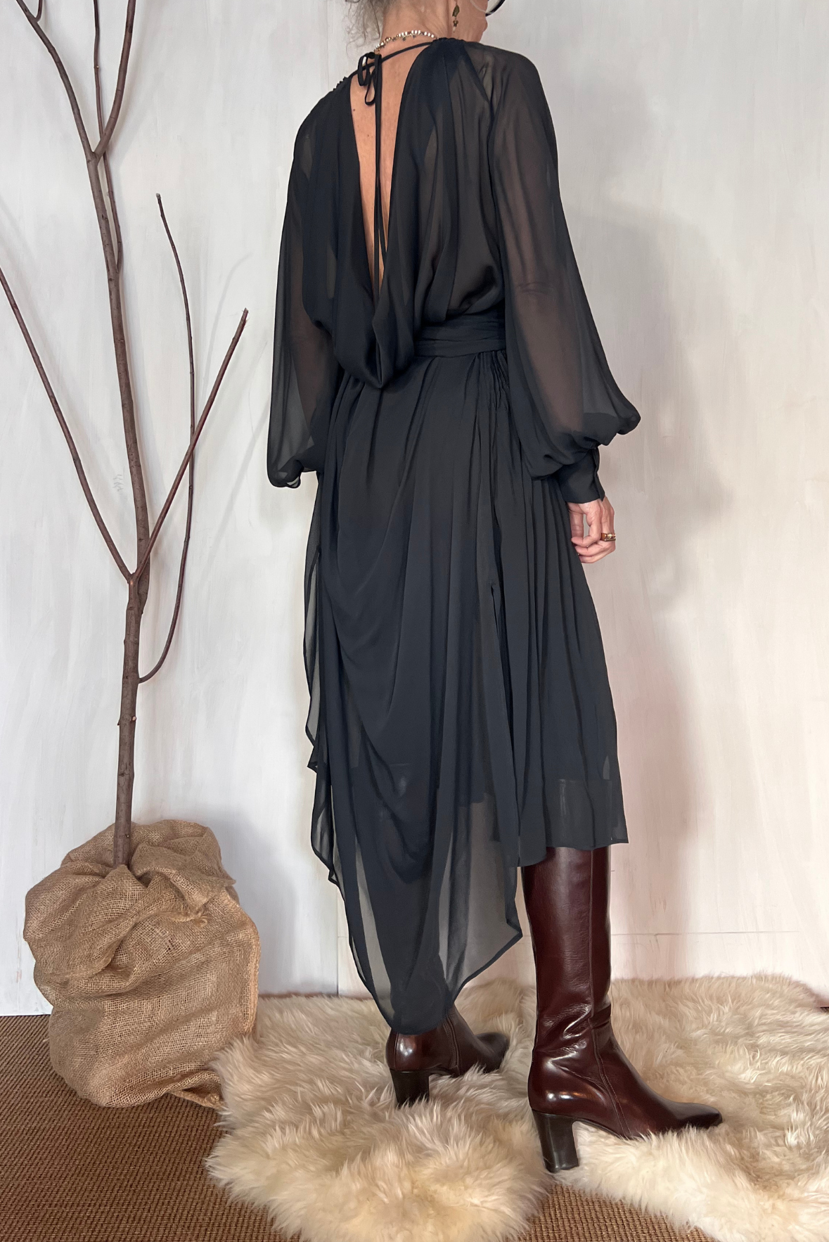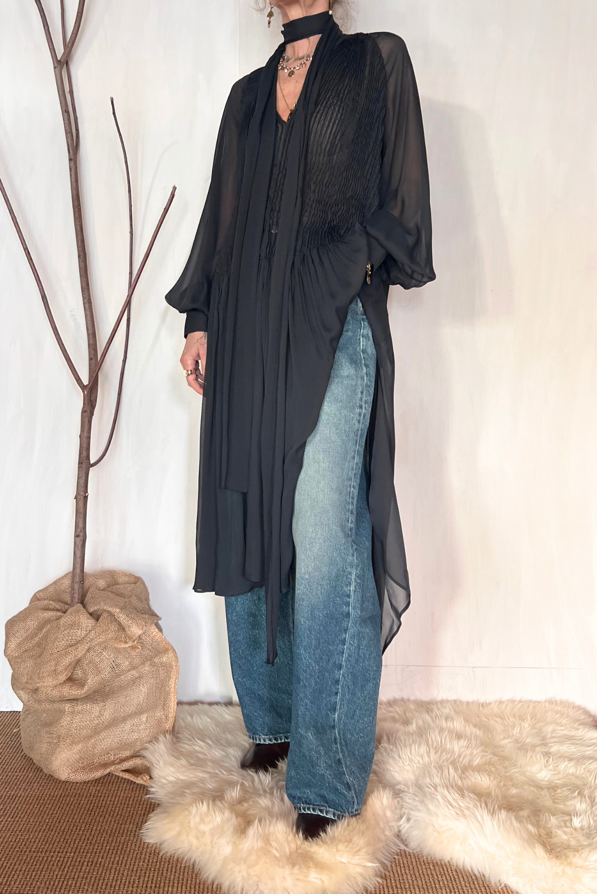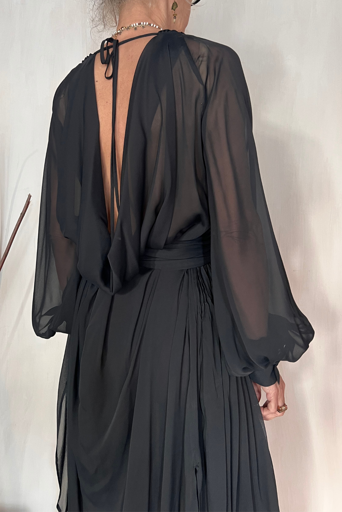 Abito lungo con foulard in tessuto misto seta plisse georgette semi-trasparente caratterizzato da una leggere increspatura. Maniche ampie lunghe con polsino con doppio bottone. Scollo a V e plissettature sul petto. Ampio scollo nella schiena. Due spacchi laterali. Orlo asimmetrico. Il foulard può essere indossato al collo o come cintura. Vestibilità ampia (taglia indossata 40 su una 40IT che veste fino ad una 44IT). Composizione 68% acetato, 32% seta