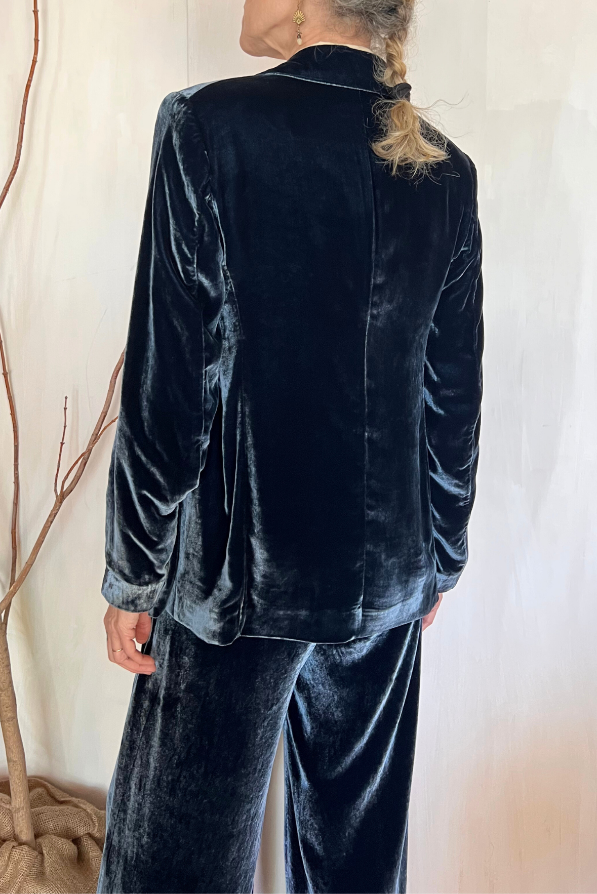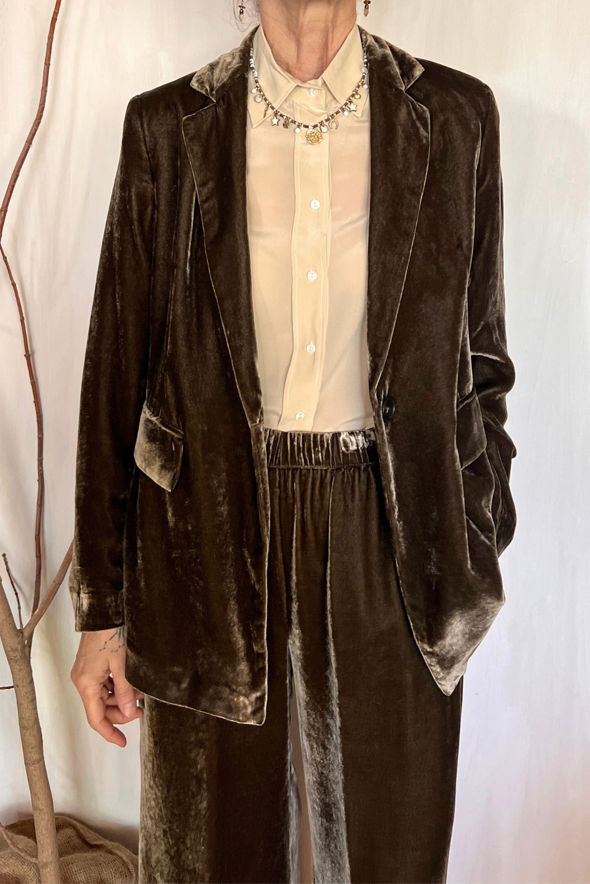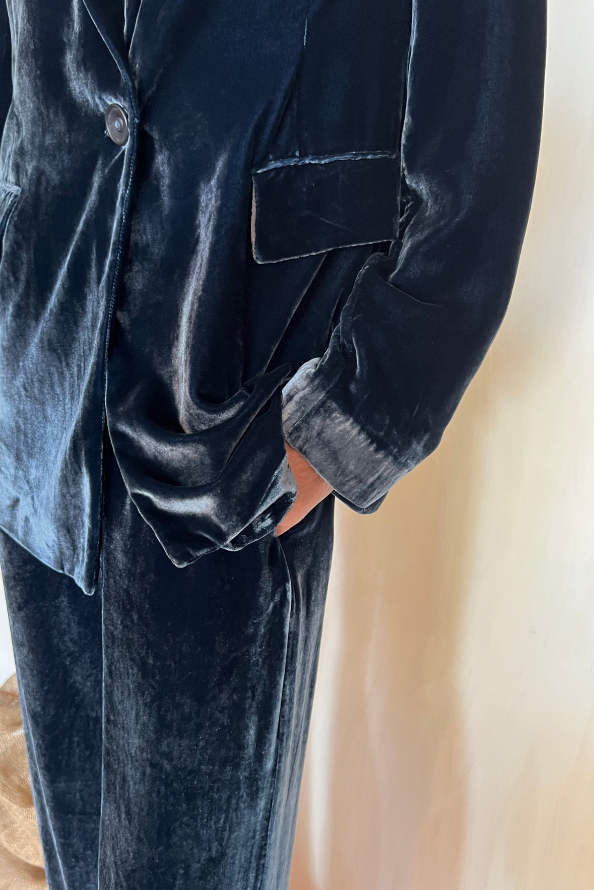 Giacca a un petto in morbido velluto. Interno foderato. Due tasche con patta sul davanti. Vestibilità morbida (taglia indossata S su una 40IT). Composizione: 82% viscosa, 18% seta